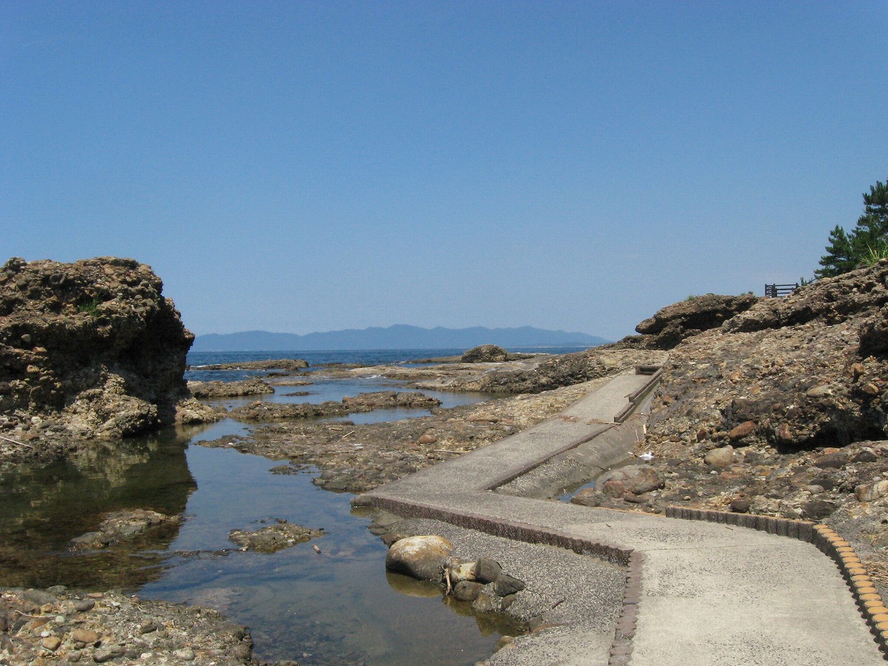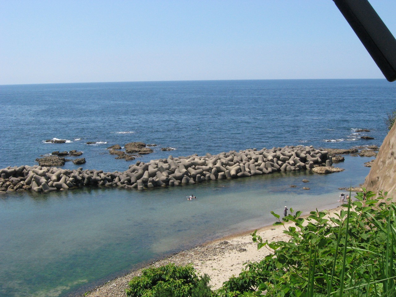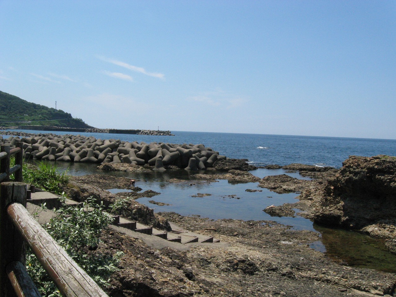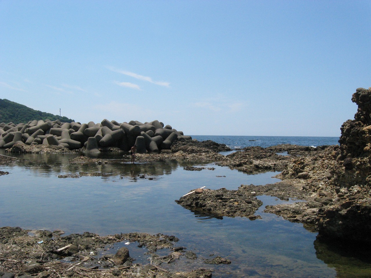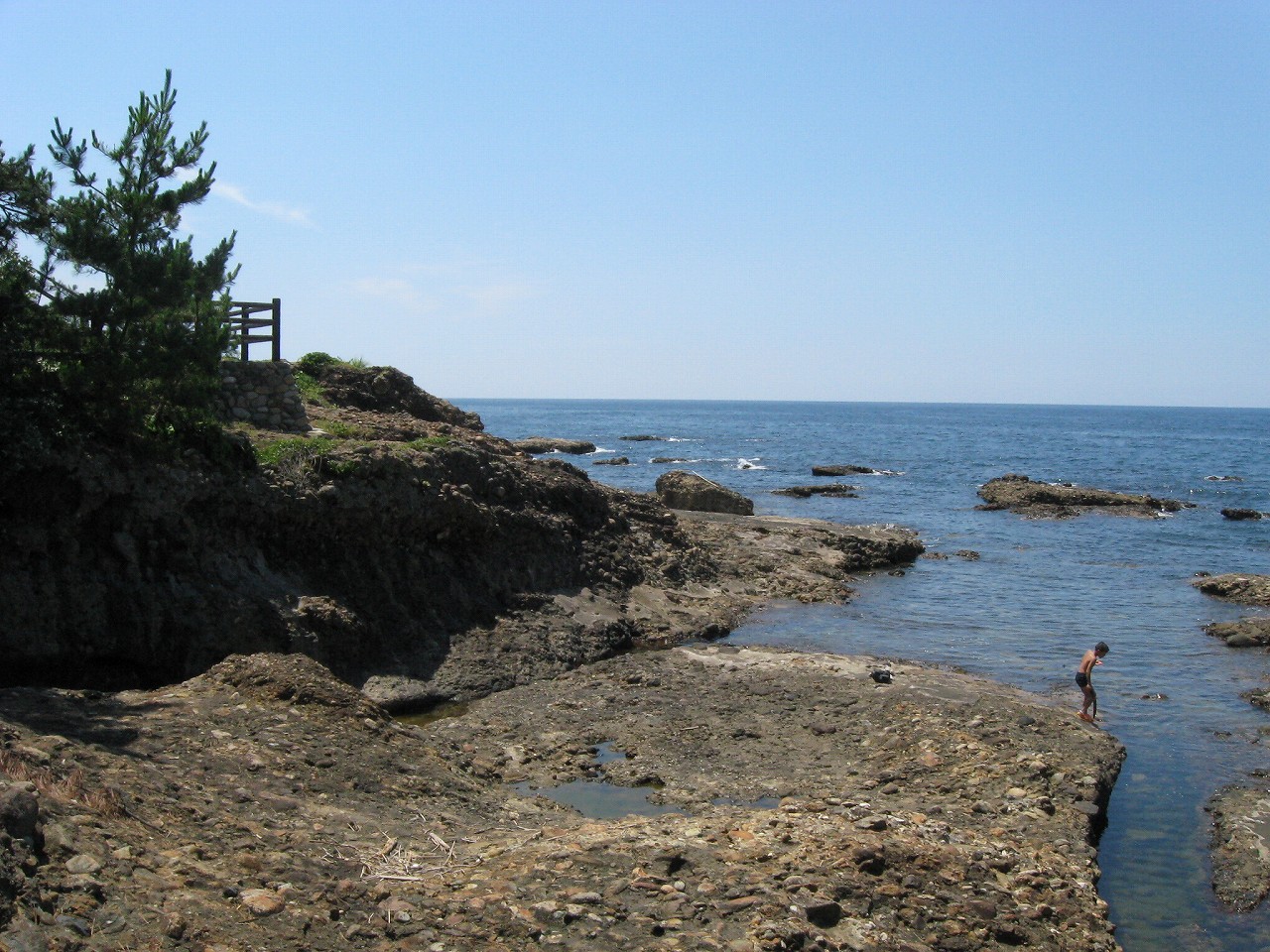 磯にコンクリートの細い舗装路があるのは未だ残る子供心をいつでも刺激してくれる。こんな道を波濤が襲ったら刺激的だろうけど、今は真夏、磯の水はぬるく、先の方では地元の子らが浮き輪浮かべて遊んでいた。山陰の方では、磯の近くの小さな浜での海水浴や、磯潜りというのは結構なされるようで、浦富海岸でもよく見かけた。内陸から来た僕としては、やはりつい、壮大な砂浜を選んでしまうというものだ。