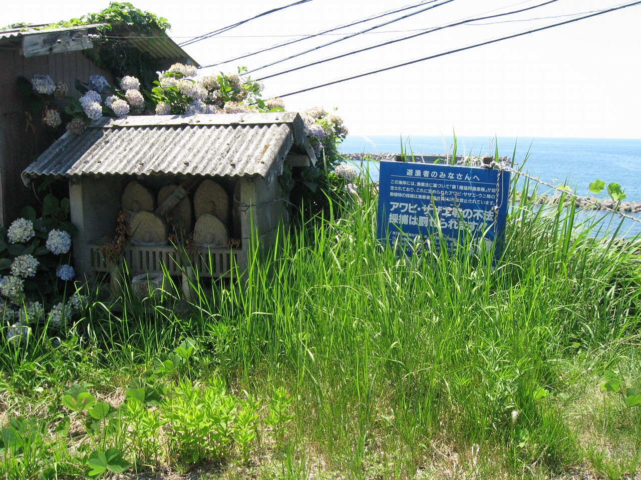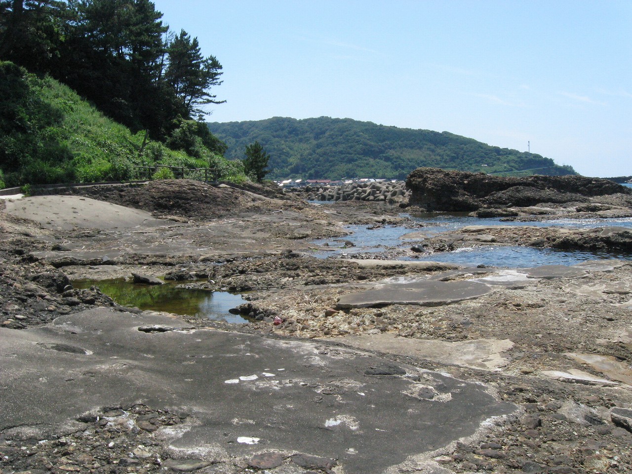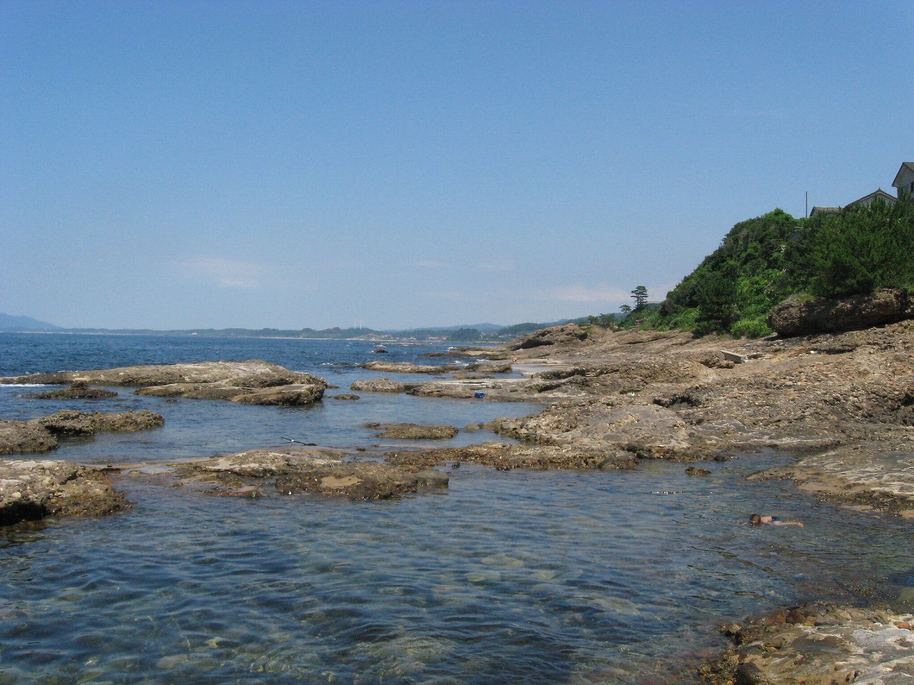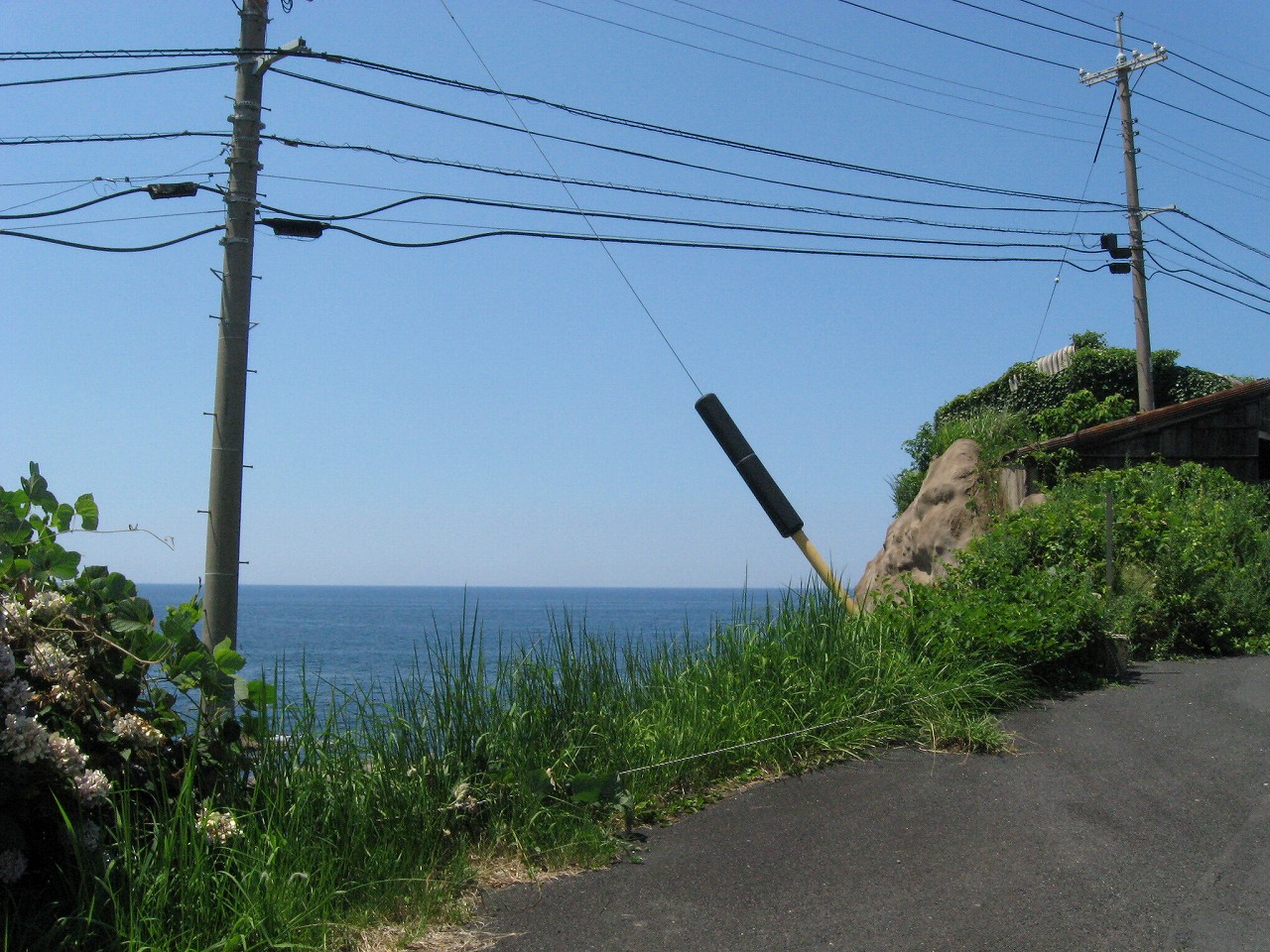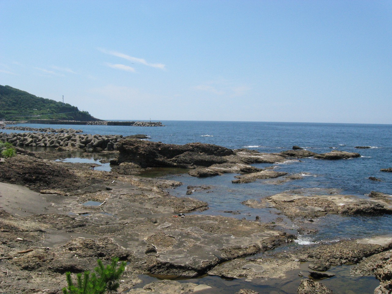 磯にコンクリートの細い舗装路があるのは未だ残る子供心をいつでも刺激してくれる。こんな道を波濤が襲ったら刺激的だろうけど、今は真夏、磯の水はぬるく、先の方では地元の子らが浮き輪浮かべて遊んでいた。山陰の方では、磯の近くの小さな浜での海水浴や、磯潜りというのは結構なされるようで、浦富海岸でもよく見かけた。内陸から来た僕としては、やはりつい、壮大な砂浜を選んでしまうというものだ。