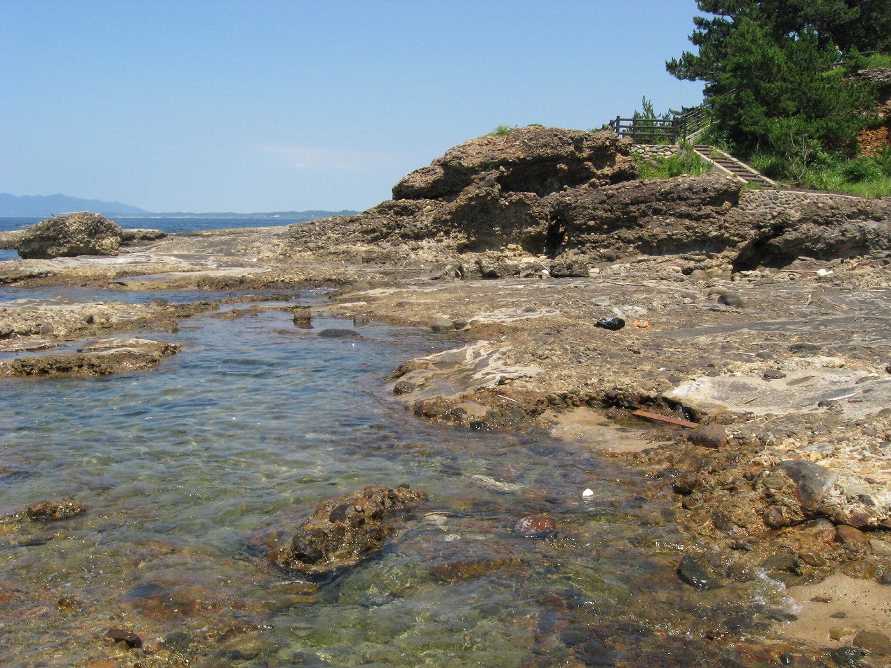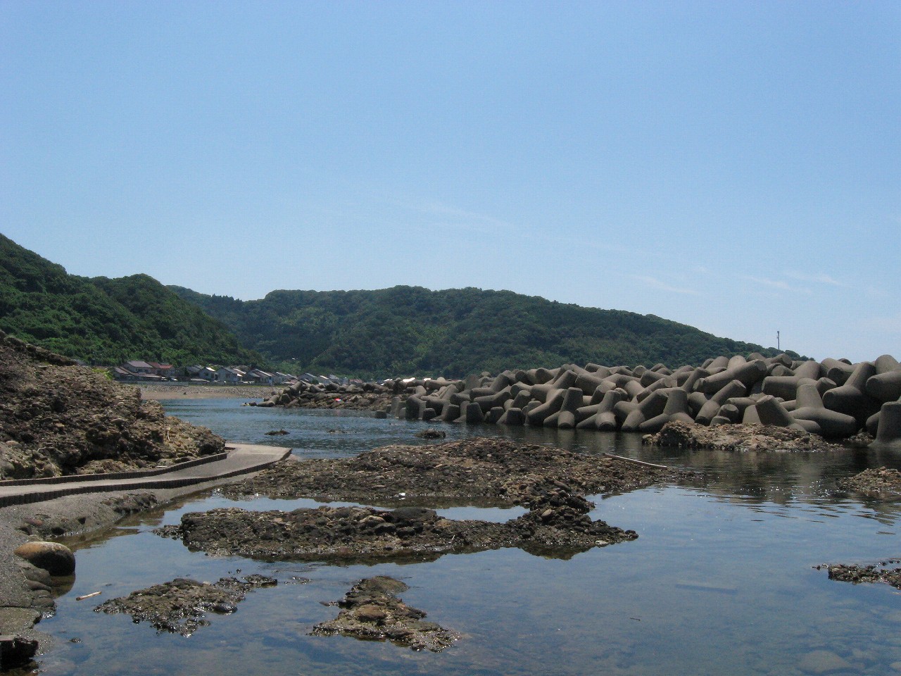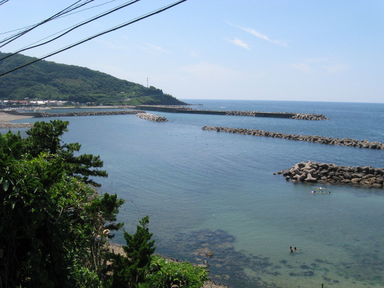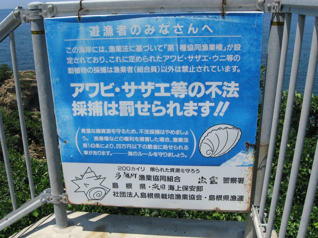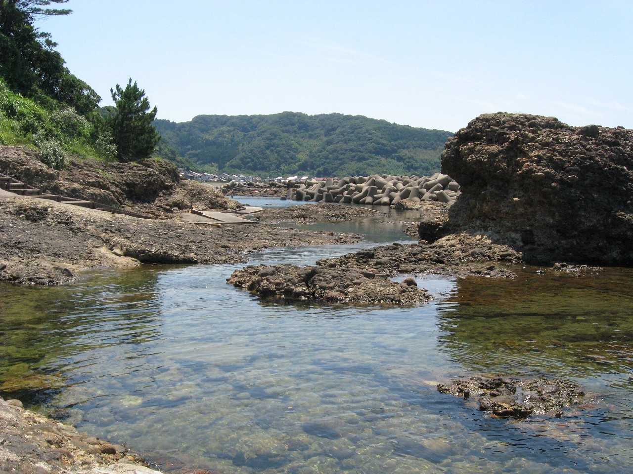 磯にコンクリートの細い舗装路があるのは未だ残る子供心をいつでも刺激してくれる。こんな道を波濤が襲ったら刺激的だろうけど、今は真夏、磯の水はぬるく、先の方では地元の子らが浮き輪浮かべて遊んでいた。山陰の方では、磯の近くの小さな浜での海水浴や、磯潜りというのは結構なされるようで、浦富海岸でもよく見かけた。内陸から来た僕としては、やはりつい、壮大な砂浜を選んでしまうというものだ。