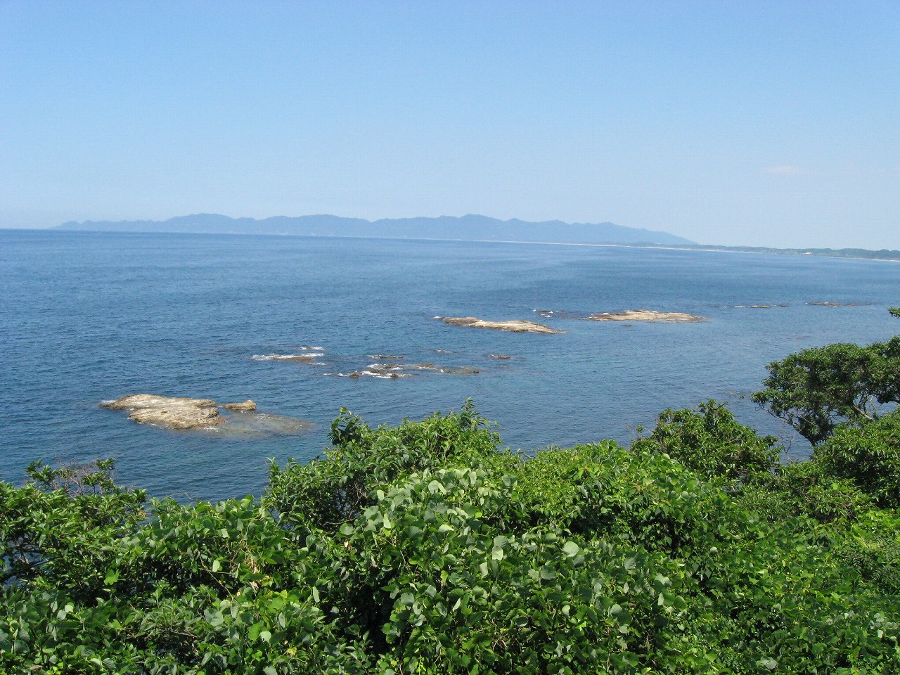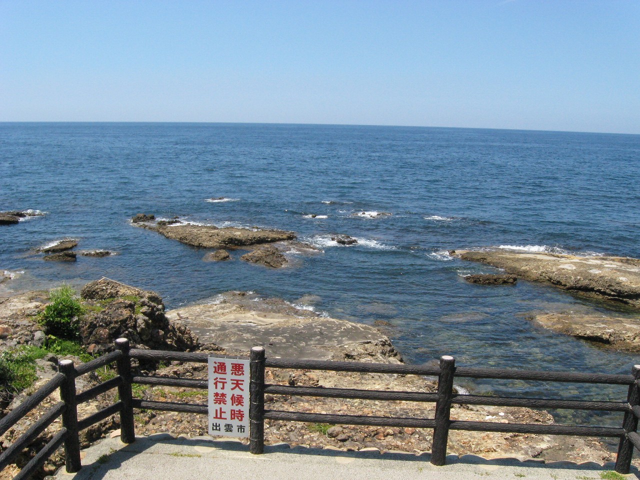 東は北海道のように雄渾に、島根半島の山容が海上にぼんわり浮かび上がり、爽快な景観を呈している。そう、ここは出雲國と石見國の境なのだ。波根から田儀までは断崖が矩形に海に突き出していて、國境を成しているのであった。
