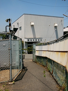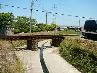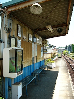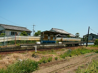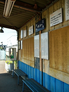 ここを左折だ。地図を見以て入り込むと、駅のありそうな雰囲気はまったくない。また間違いか。しかしおそるおそる進むと、なんだか車検センターみたいで、長い石の土台に車が何台か載っかっているのである。確かにプラットホームみたいだが、駅の雰囲気はまったくない。おかしいなと思いつつもそこを回り込むと、あった、離れたところに三木駅駅舎。