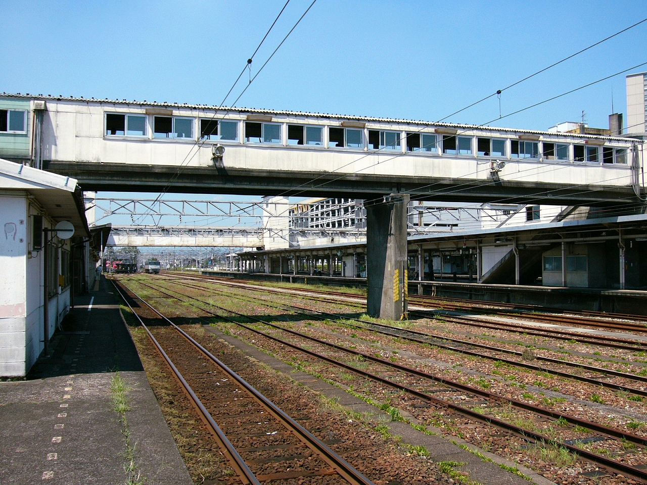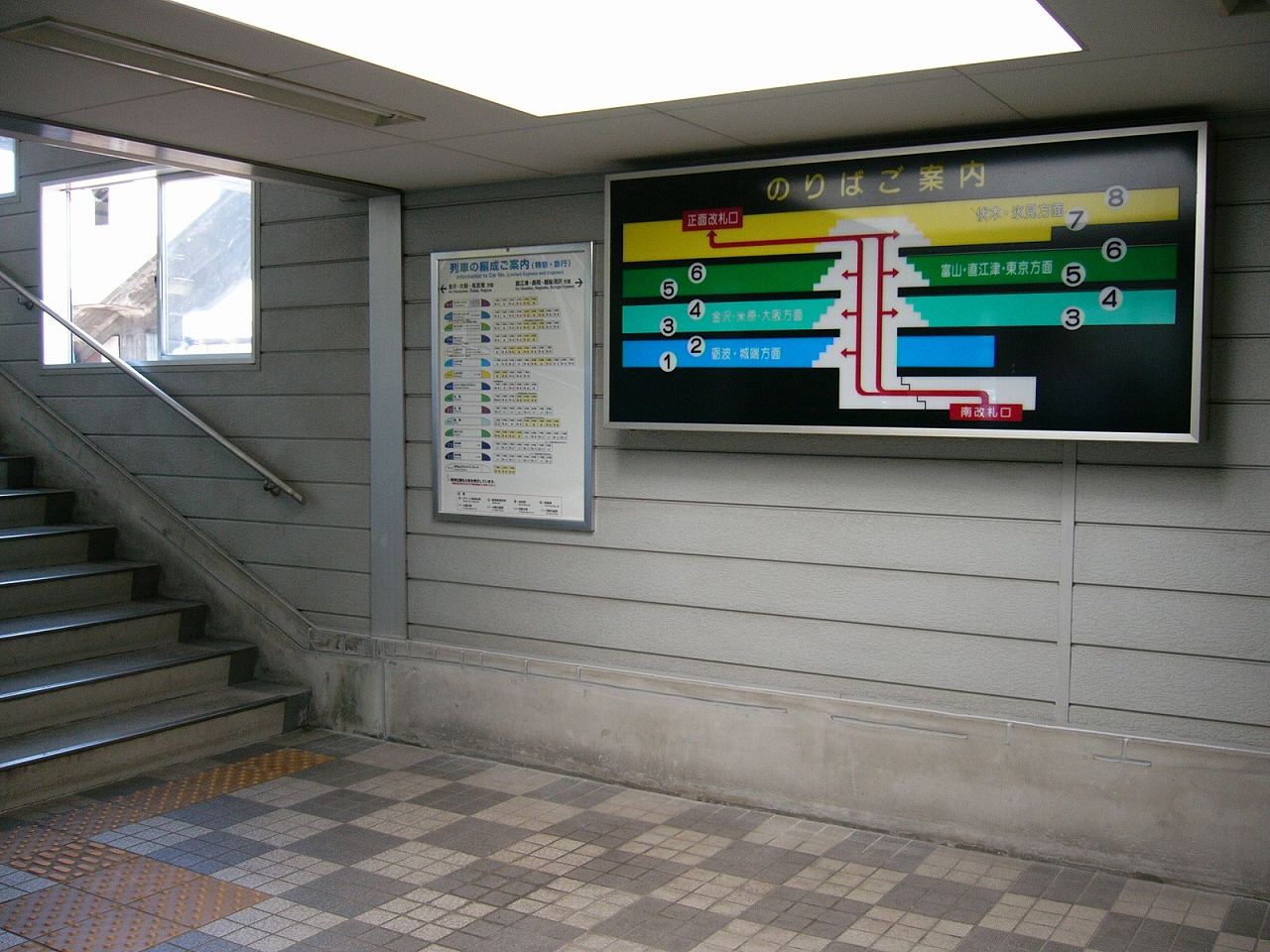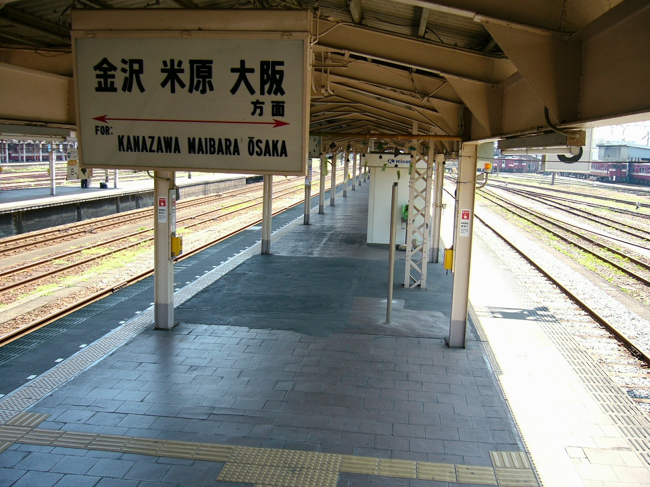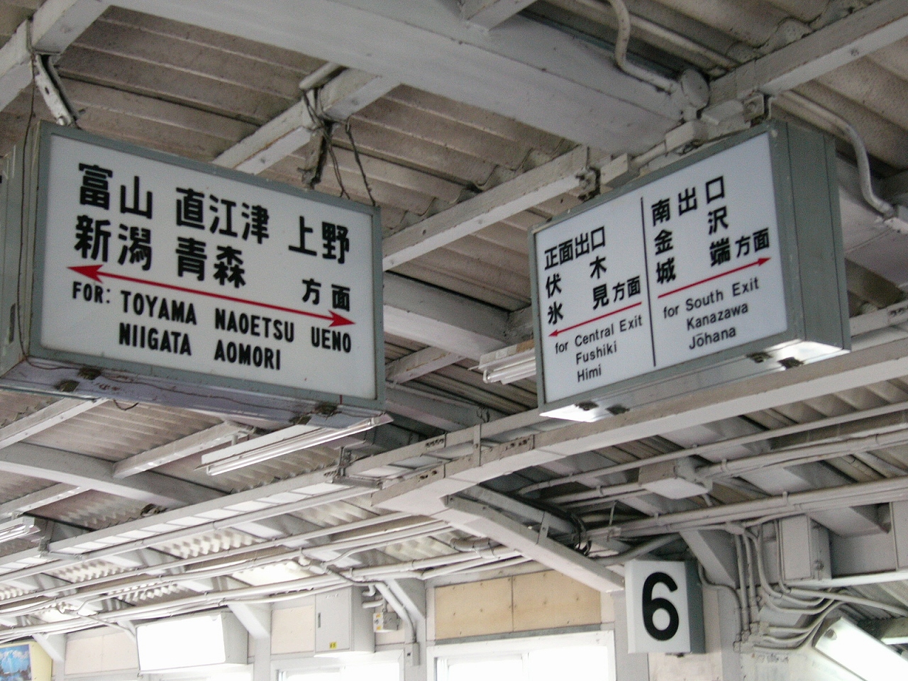 跨線橋内に金沢や富山、米原、大阪の案内はともかく、青森、東京、上野と出ていて、北陸のよさが滲み出ている。高速交通の東海道と違い、ここそのものが旅らしい感じの土地だから、さらに旅が重なるようで、旅の二重構造になっている。