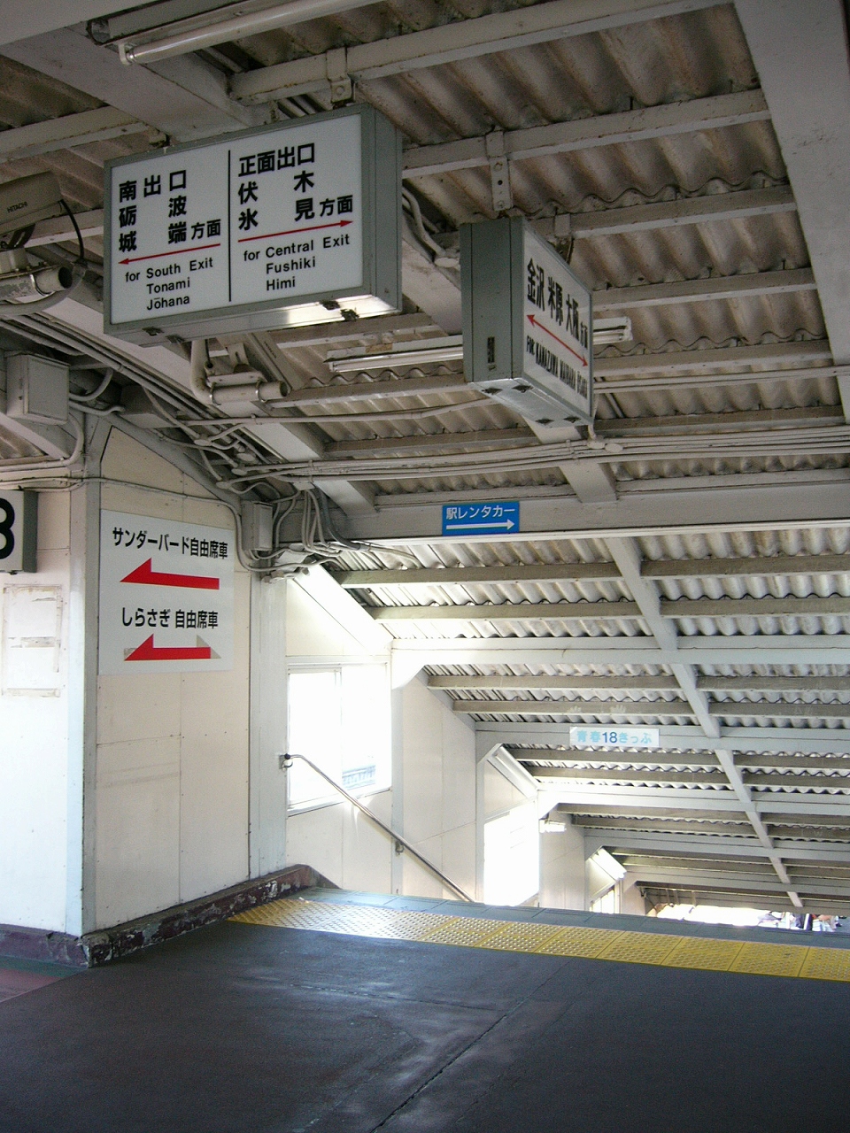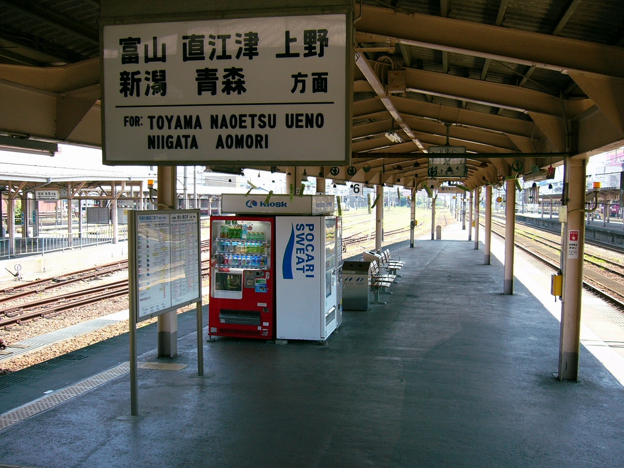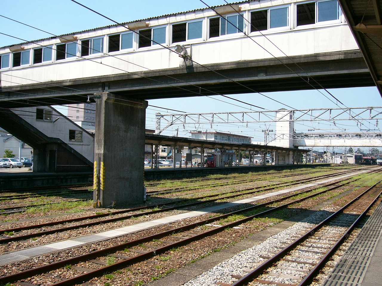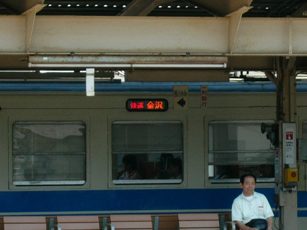 跨線橋内に金沢や富山、米原、大阪の案内はともかく、青森、東京、上野と出ていて、北陸のよさが滲み出ている。高速交通の東海道と違い、ここそのものが旅らしい感じの土地だから、さらに旅が重なるようで、旅の二重構造になっている。