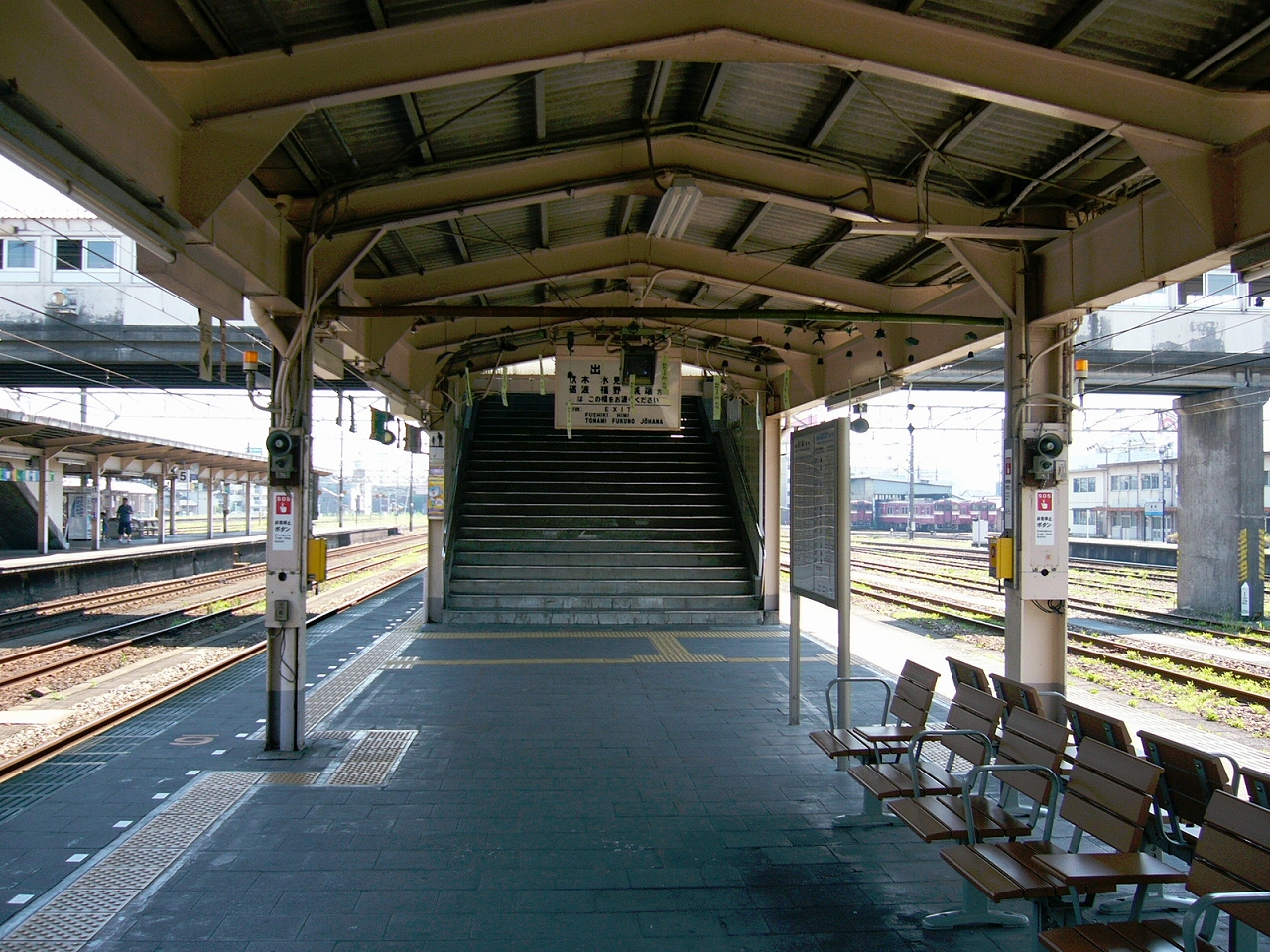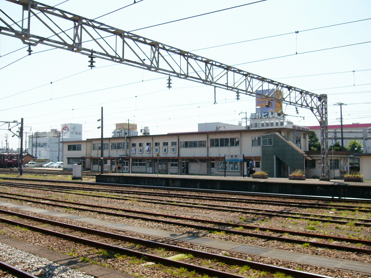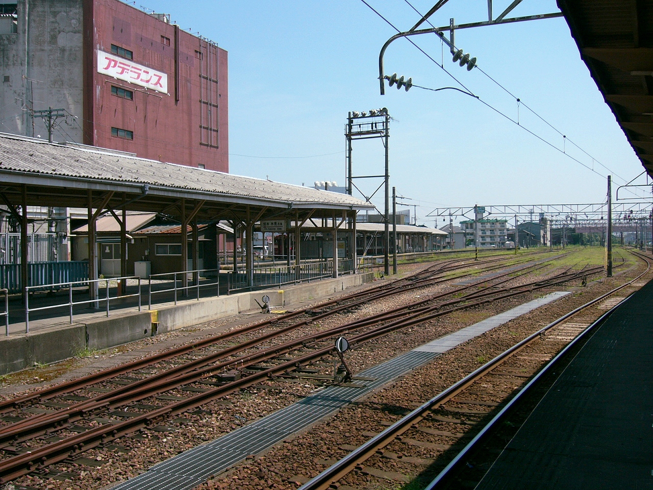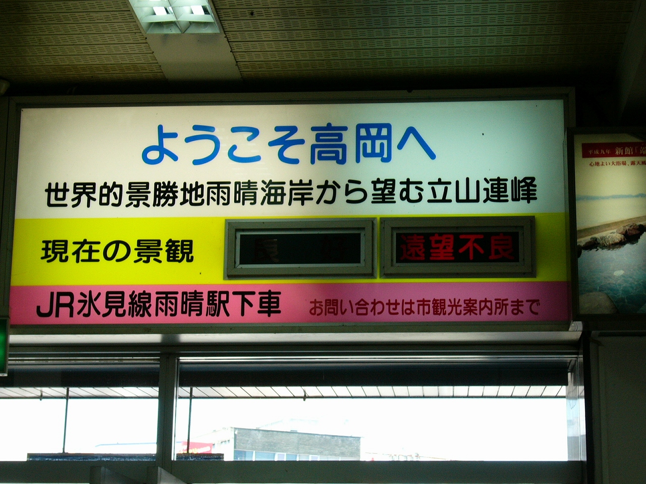跨線橋内に金沢や富山、米原、大阪の案内はともかく、青森、東京、上野と出ていて、北陸のよさが滲み出ている。高速交通の東海道と違い、ここそのものが旅らしい感じの土地だから、さらに旅が重なるようで、旅の二重構造になっている。