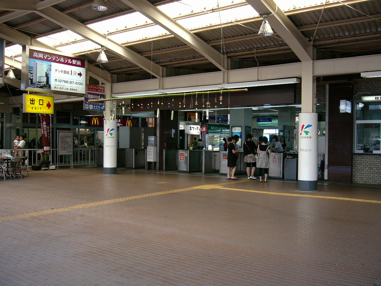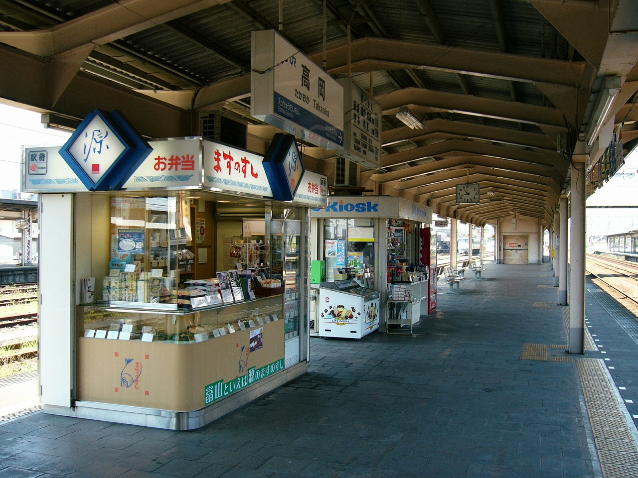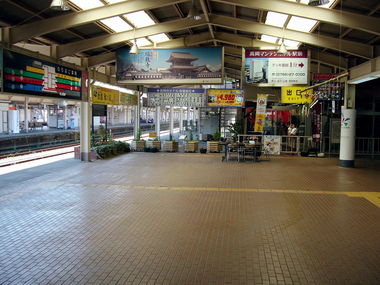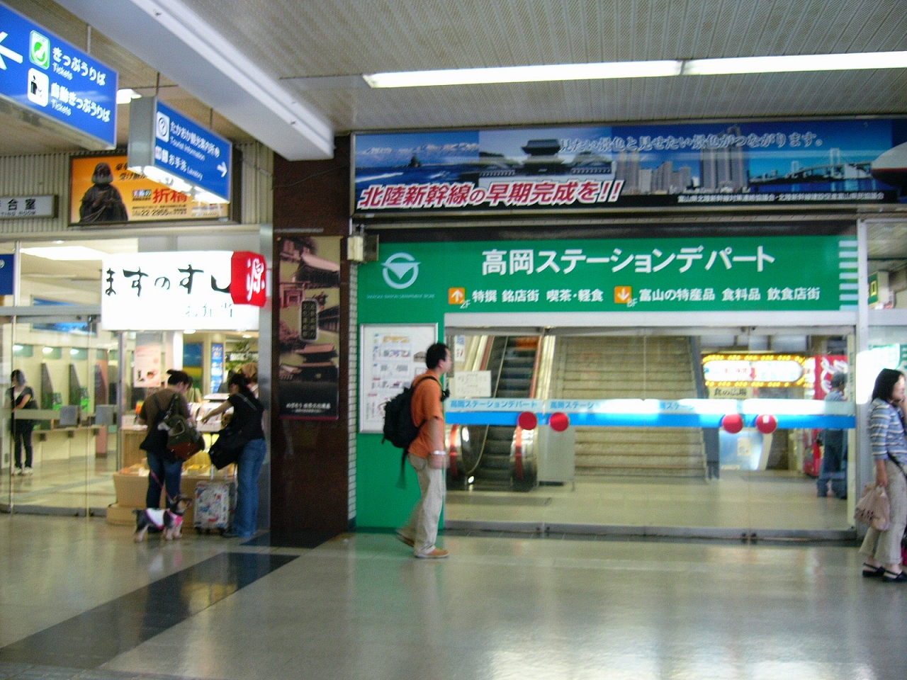 数々のラッチの中の一つをくぐり、中に入った。ちょっと暗めだが、白を基調に改装していて、外観の時代とは違っていた。マクドナルドが改札口の真横に入っていて、便利さに瞠目。高岡はやることが土地の割りに新しいのだろうか。CHAOという北陸ではなじみの深い売店も入っているがここは観光客向けで、おみやげ品がいっぱいだった。駅前横町がおもしろい。ほかの駅と違い通路が広く、待合所のほか、駅弁屋やそば屋が軒を連ねている。変わったものにコーヒーコーナーがあった。