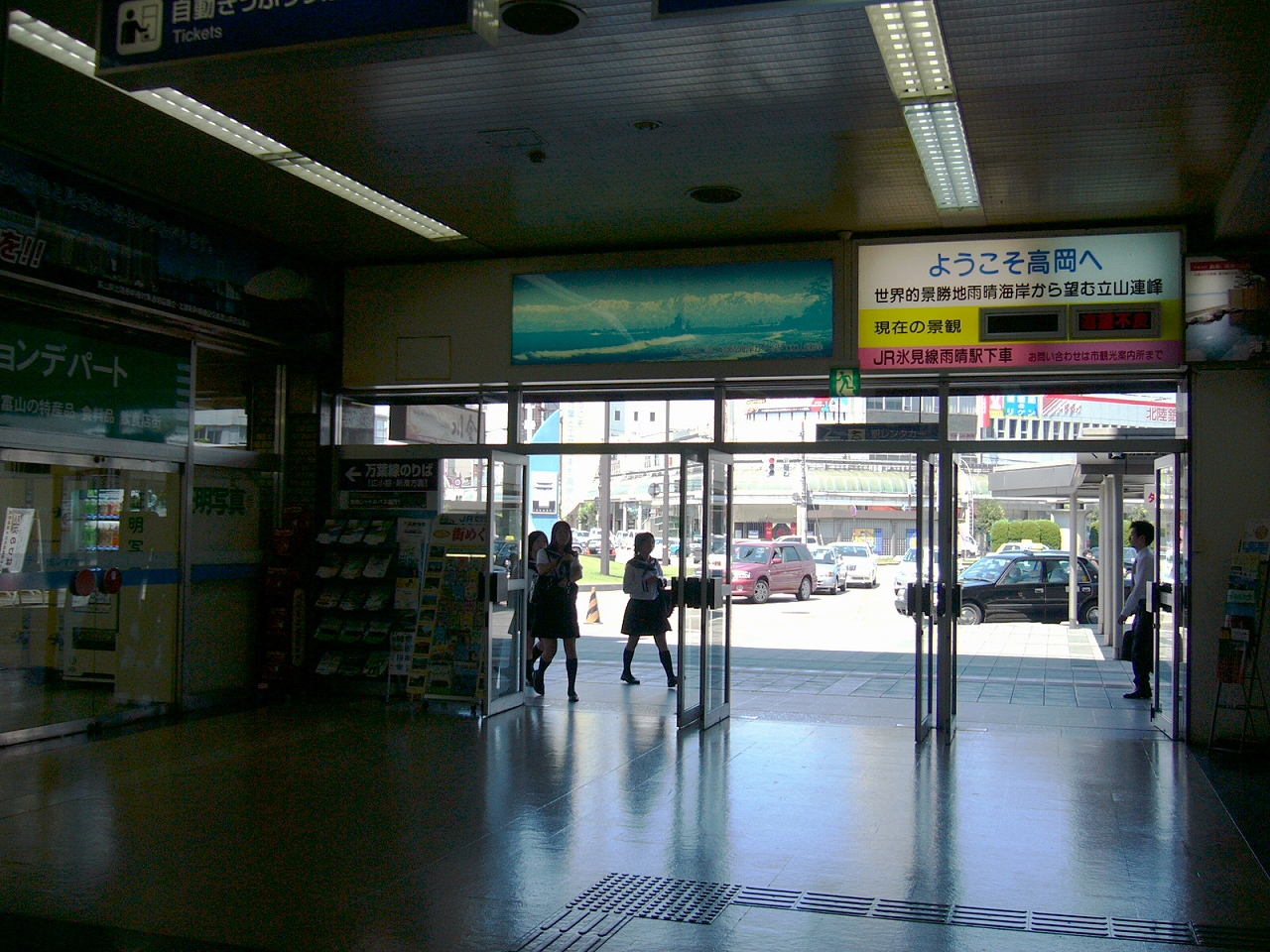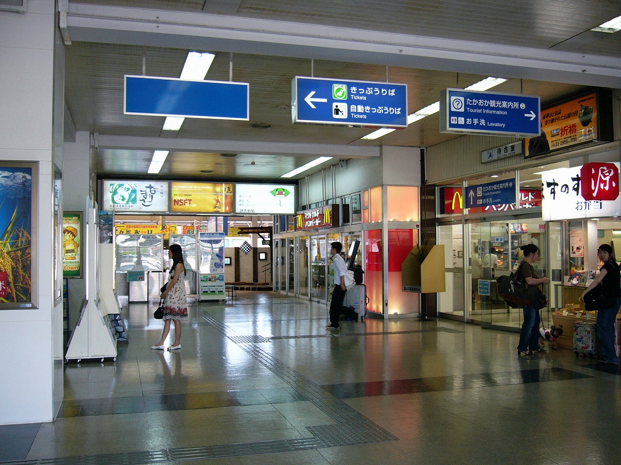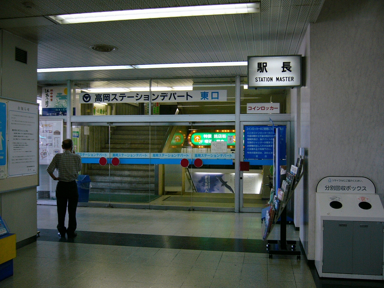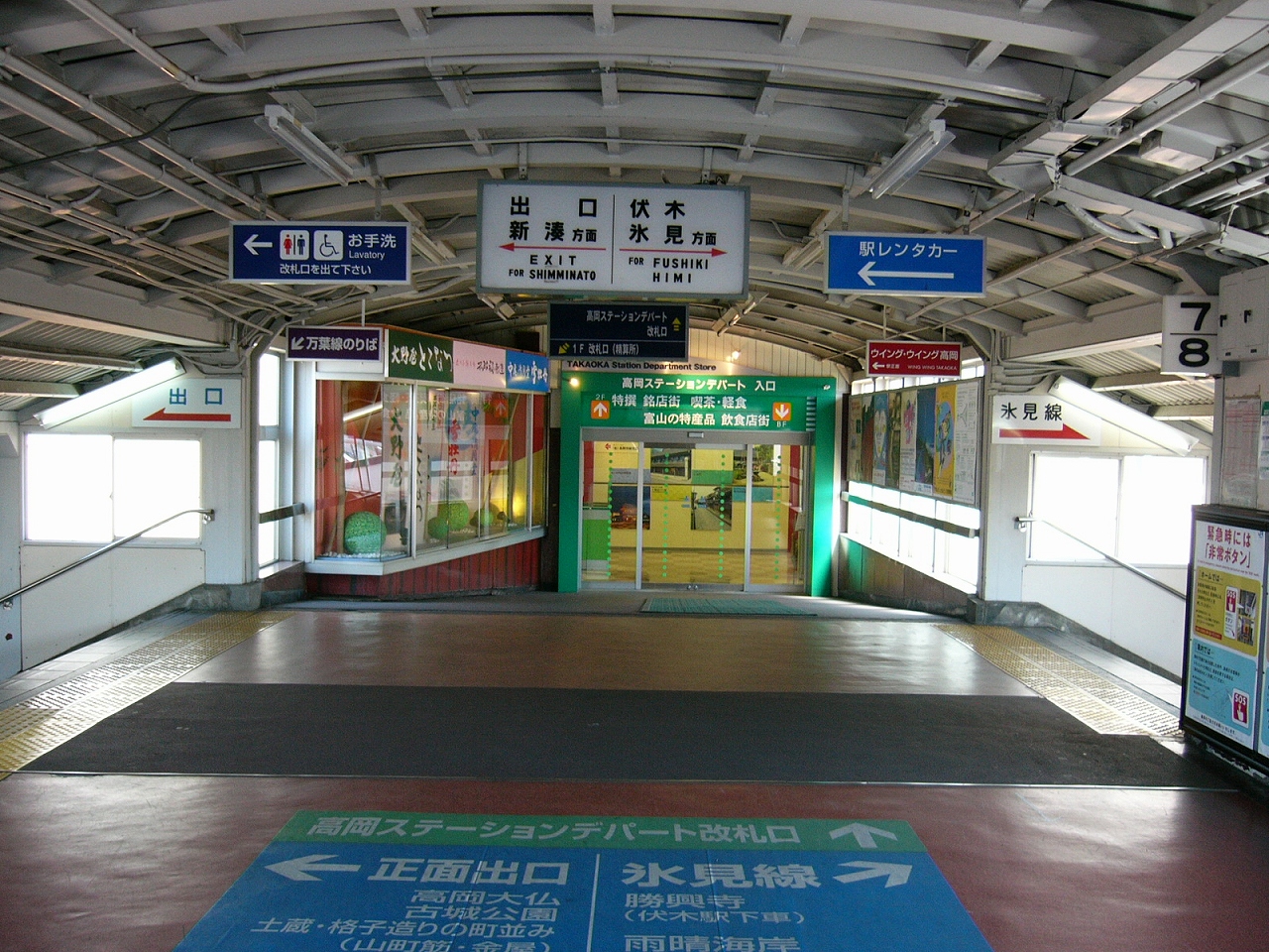 数々のラッチの中の一つをくぐり、中に入った。ちょっと暗めだが、白を基調に改装していて、外観の時代とは違っていた。マクドナルドが改札口の真横に入っていて、便利さに瞠目。高岡はやることが土地の割りに新しいのだろうか。CHAOという北陸ではなじみの深い売店も入っているがここは観光客向けで、おみやげ品がいっぱいだった。駅前横町がおもしろい。ほかの駅と違い通路が広く、待合所のほか、駅弁屋やそば屋が軒を連ねている。変わったものにコーヒーコーナーがあった。