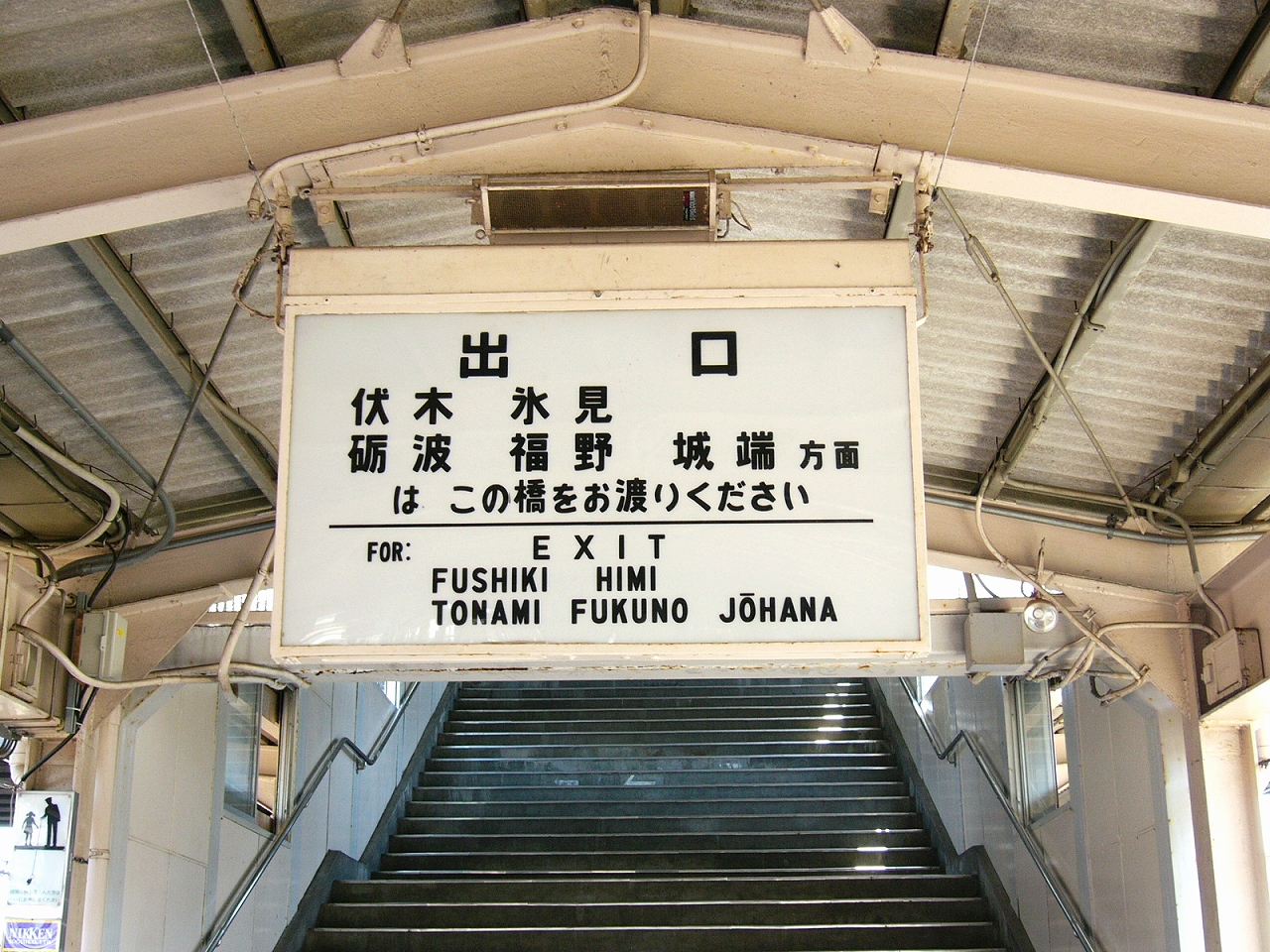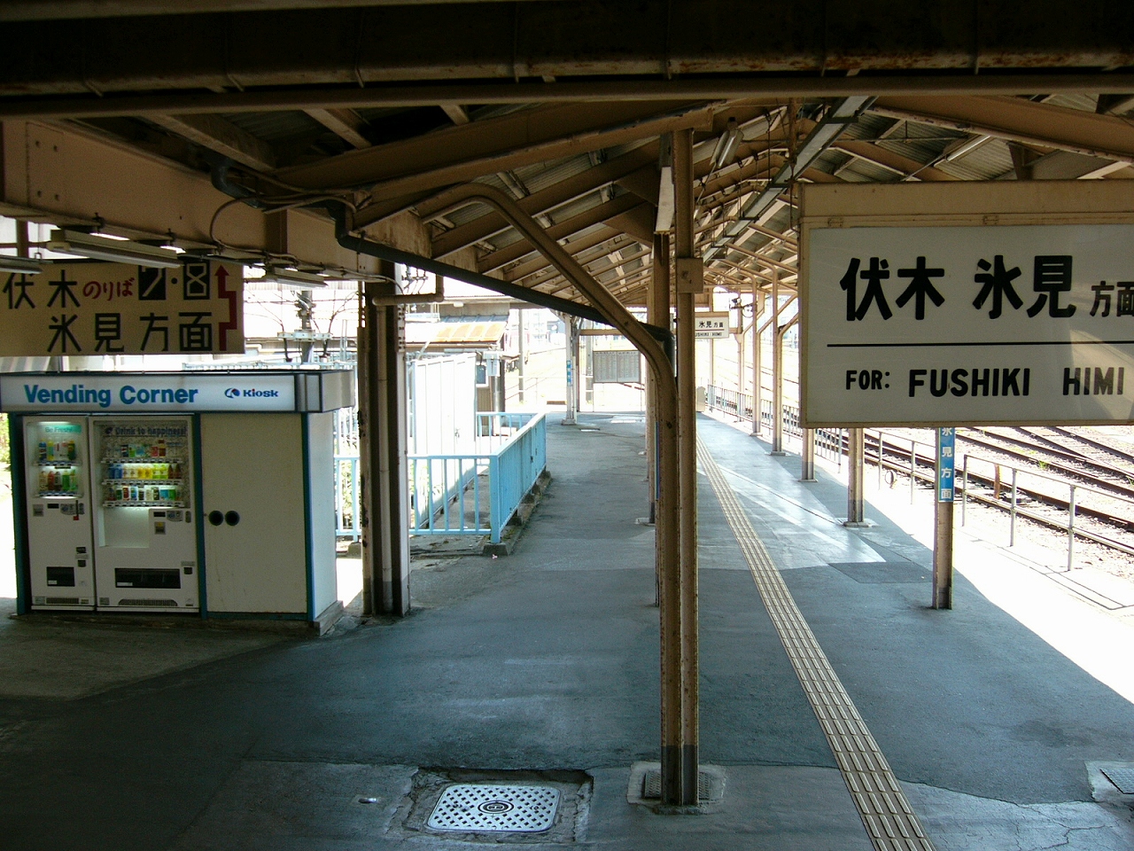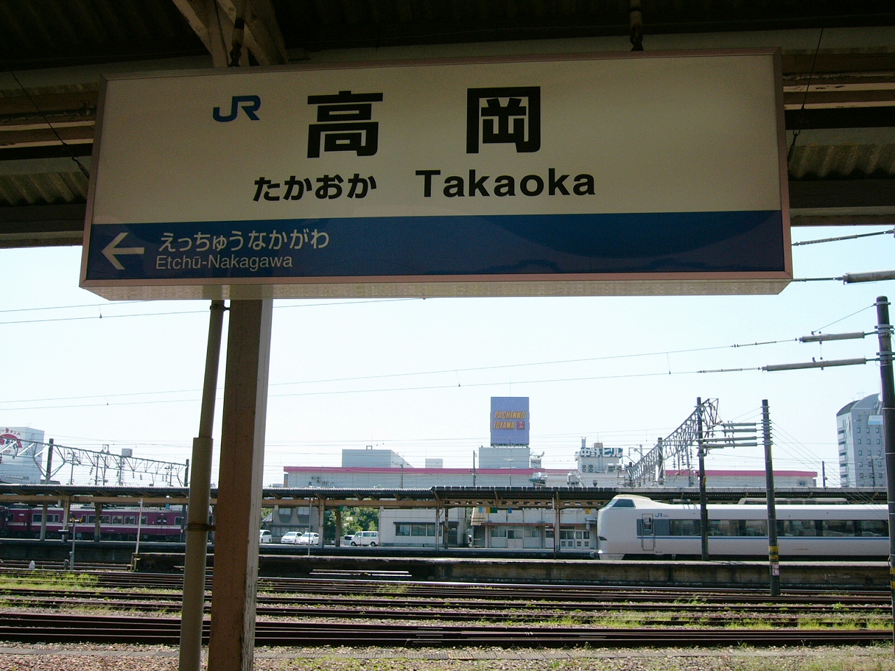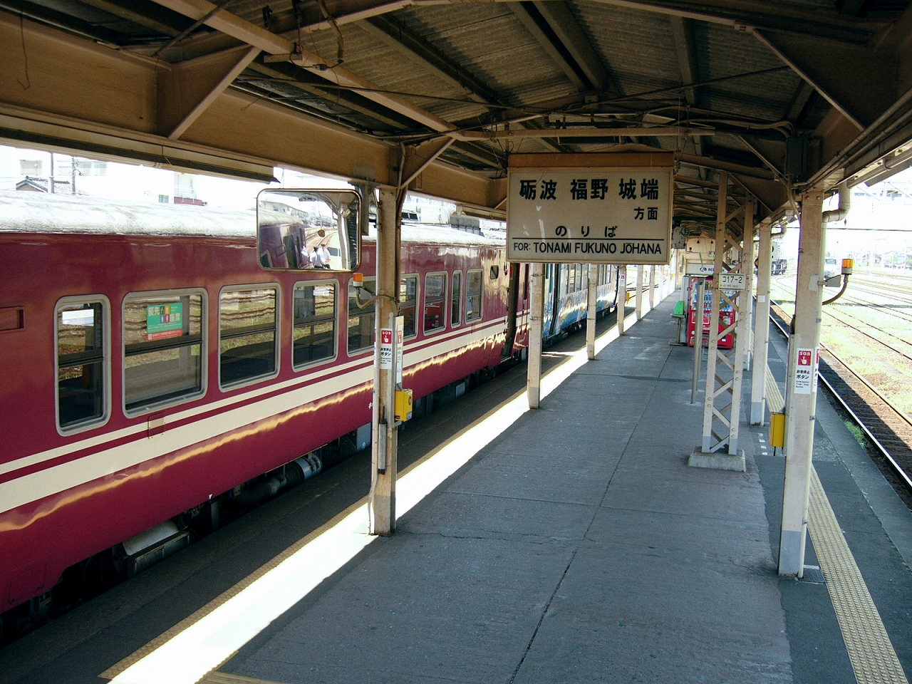 昔、乗らん、とするとき、このいろいろな特急の中でただ一つにしか乗れないことが、もどかしくなったものだった。ぜんぶ乗りたい。だが今は、それどころか、今年はこれ一つ。これを大事にせないかんのだなと、入ってくる列車に、何らかの特別さを汲み取ろうとした。そもそもそれぞれの種別は、それぞれの地元の利用の便に応えたもので、住まいという拠点がある以上、ほとんどは乗る必要の存しえないものだ。ここを踏み越えると、それまでとは違って、旅というより、列車、鉄道そのものに偏向していく。自分の下車旅もそうで、そんなものを案外、本物らしく綴ることになるだけらしいのだった。でも、我慢できぬ、駅名標を見上げると、両隣の駅は聞いたこともないような駅。「にしたかおか」なんて、いかにも小さそうだし、「えっちゅうだいもん」に至っては、なんだかどうしても降りたくなってしまう。特急旅行者にはおよそ用事のなさそうな駅なのに、どうどうと矢印で案内されている。ここ高岡しか知らないことがくやしくなる。