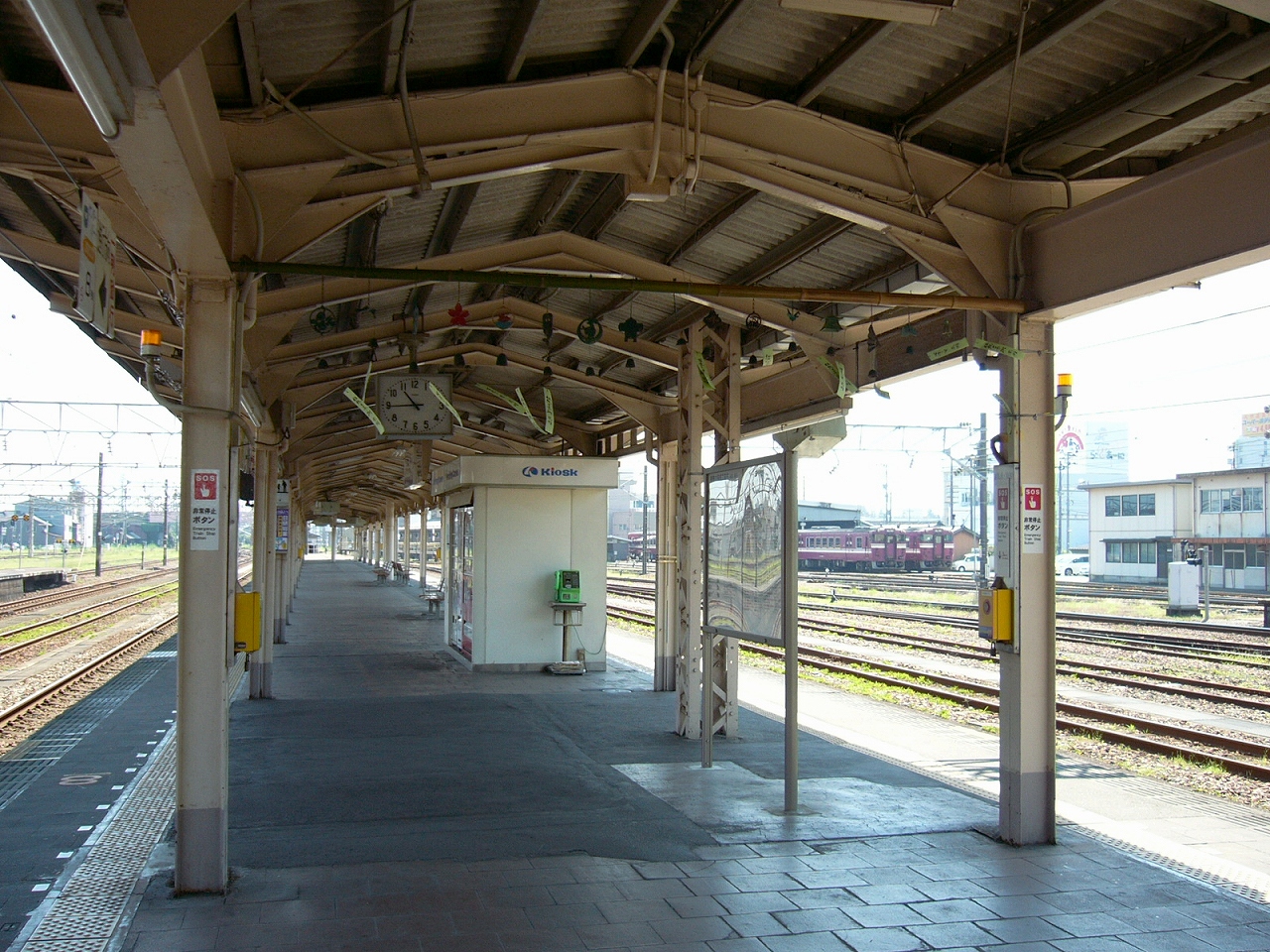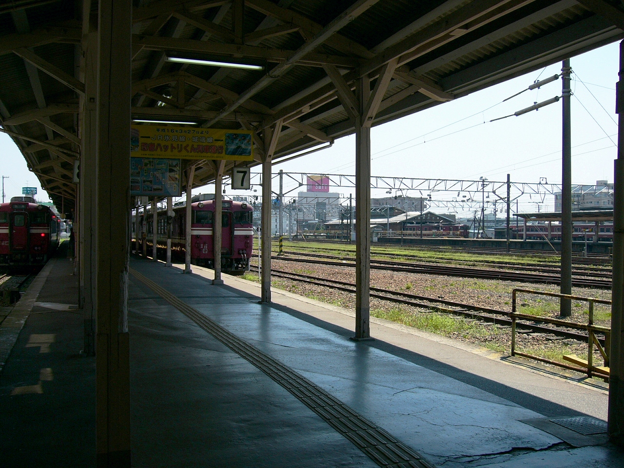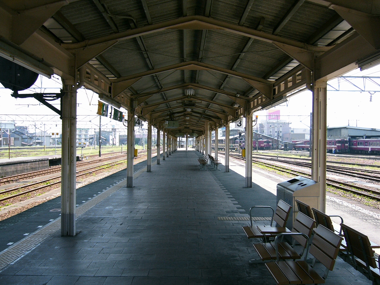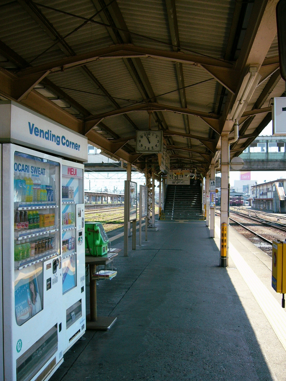 氷見線ホームはステーションビル2階直結の有人改札に入るか入らないの目前にして、さっと右に下りる。木柱の通路を歩いて、離れ小島に着く。どっどっとエンジンを鳴らして気動車が両端に待機。この7番線からが、いちばんよく高岡駅構内が見渡せる。東側なのだが、構内の中でも最もおもしろいところとなっている。小さい子が母に、そこに立って呼びかけられ、母、屈んで小さいカメラでその子と気動車を写す。氷見線を乗り終えたばかりのようだった。氷見線はアニメキャラクターの列車も走り、海際高く眺望がよいところがあるから、人気である。何だかんだ言って、ささやかな思い出作り、それは本当は、私も変わらないのだ。しかしそれができていないのではないかといつも気にしている。