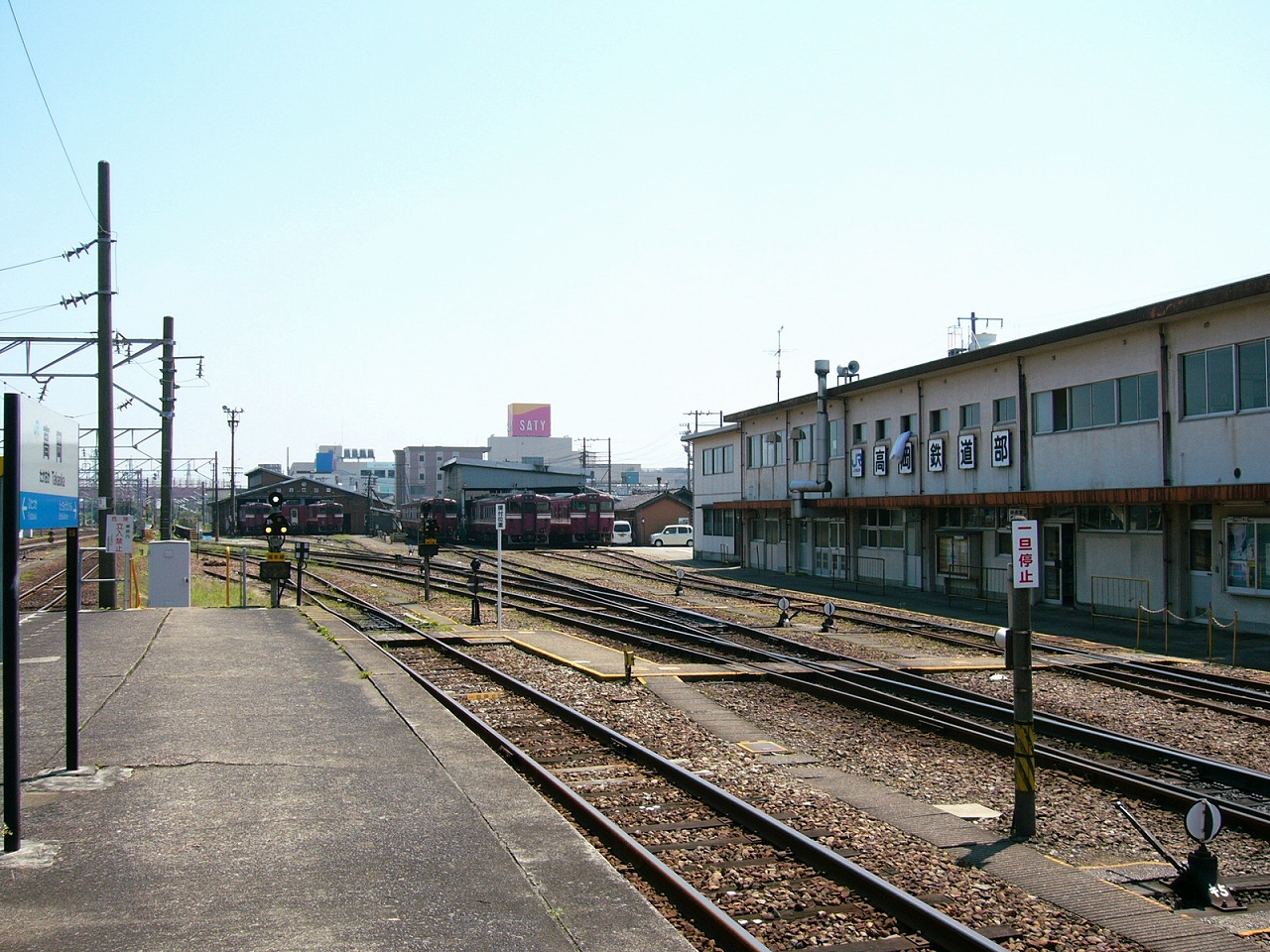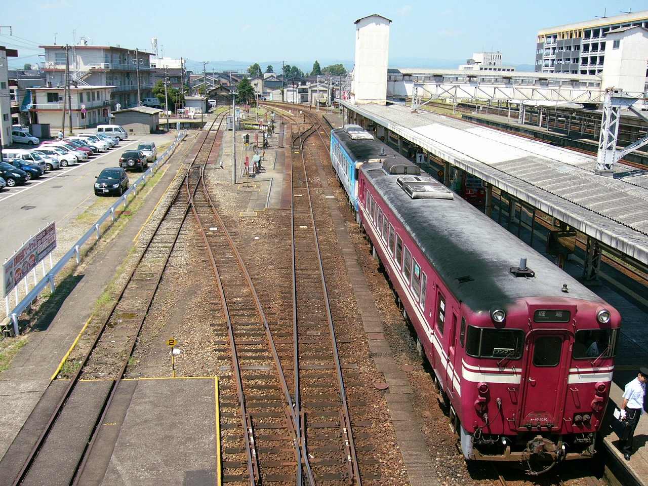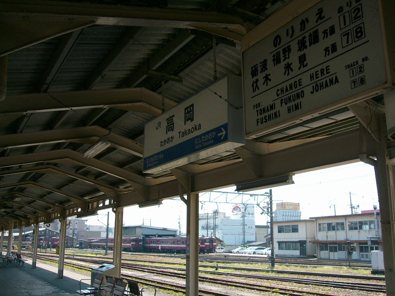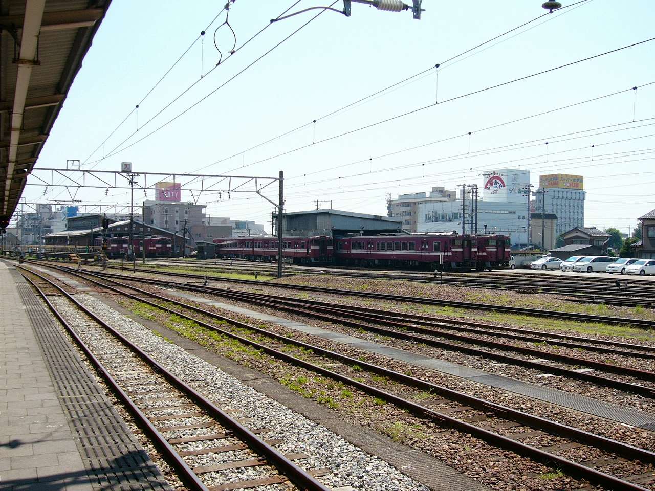 高岡には臙脂色の気動車が似合う。火が熾って赤くなったバラストの上に、何編成も並んでいて、かげろうでゆらめていた。上の跨線橋も煤煙で黒く棚引いている。あの編成らは今焼かれているのだ。高岡機関区を併設し、待機や整備をしているのだが、二階建ての高岡鉄道部もあって、ちょくちょく運転士がこの暑いのにしゃんと構内通路を歩いて、出入りしている。これら気動車は氷見線と城端線で使われるのだが、こうして運転士の交代を見ていると、もう本線と遜色なく、その必要性が息づいているようだった。