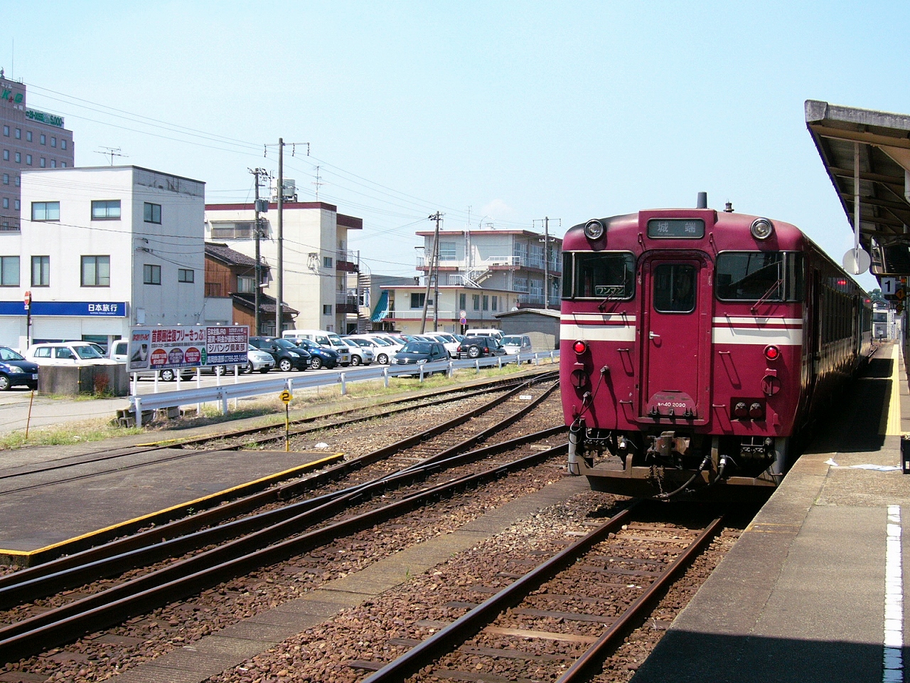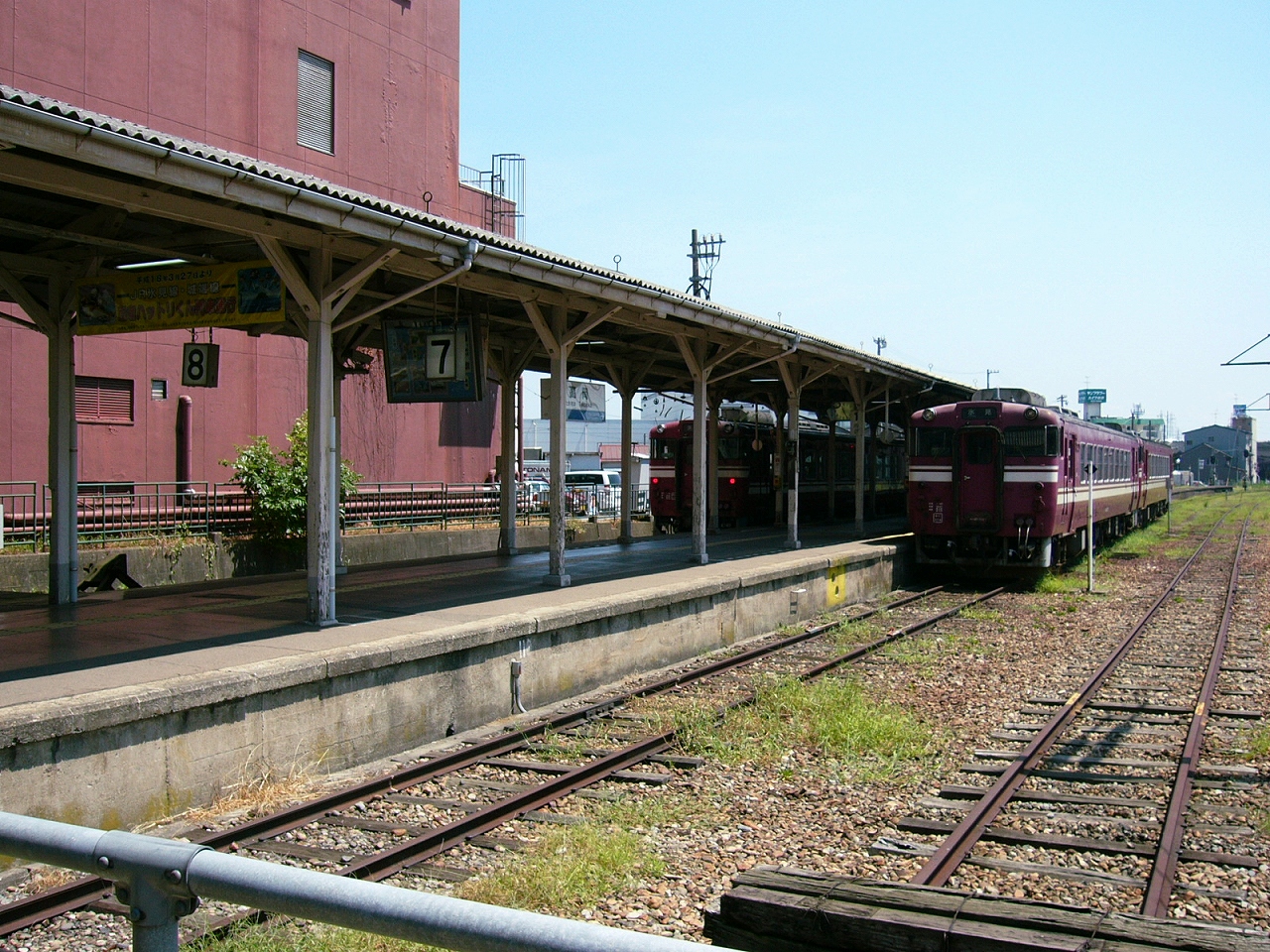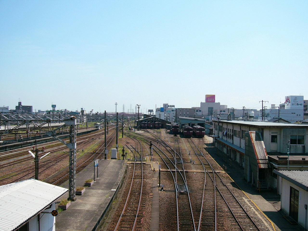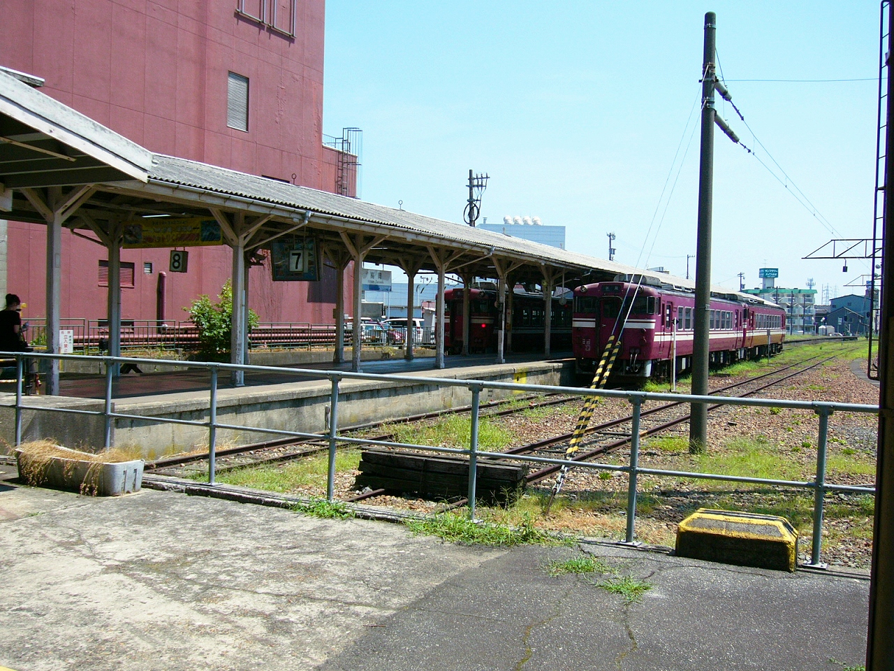 高岡には臙脂色の気動車が似合う。火が熾って赤くなったバラストの上に、何編成も並んでいて、かげろうでゆらめていた。上の跨線橋も煤煙で黒く棚引いている。あの編成らは今焼かれているのだ。高岡機関区を併設し、待機や整備をしているのだが、二階建ての高岡鉄道部もあって、ちょくちょく運転士がこの暑いのにしゃんと構内通路を歩いて、出入りしている。これら気動車は氷見線と城端線で使われるのだが、こうして運転士の交代を見ていると、もう本線と遜色なく、その必要性が息づいているようだった。