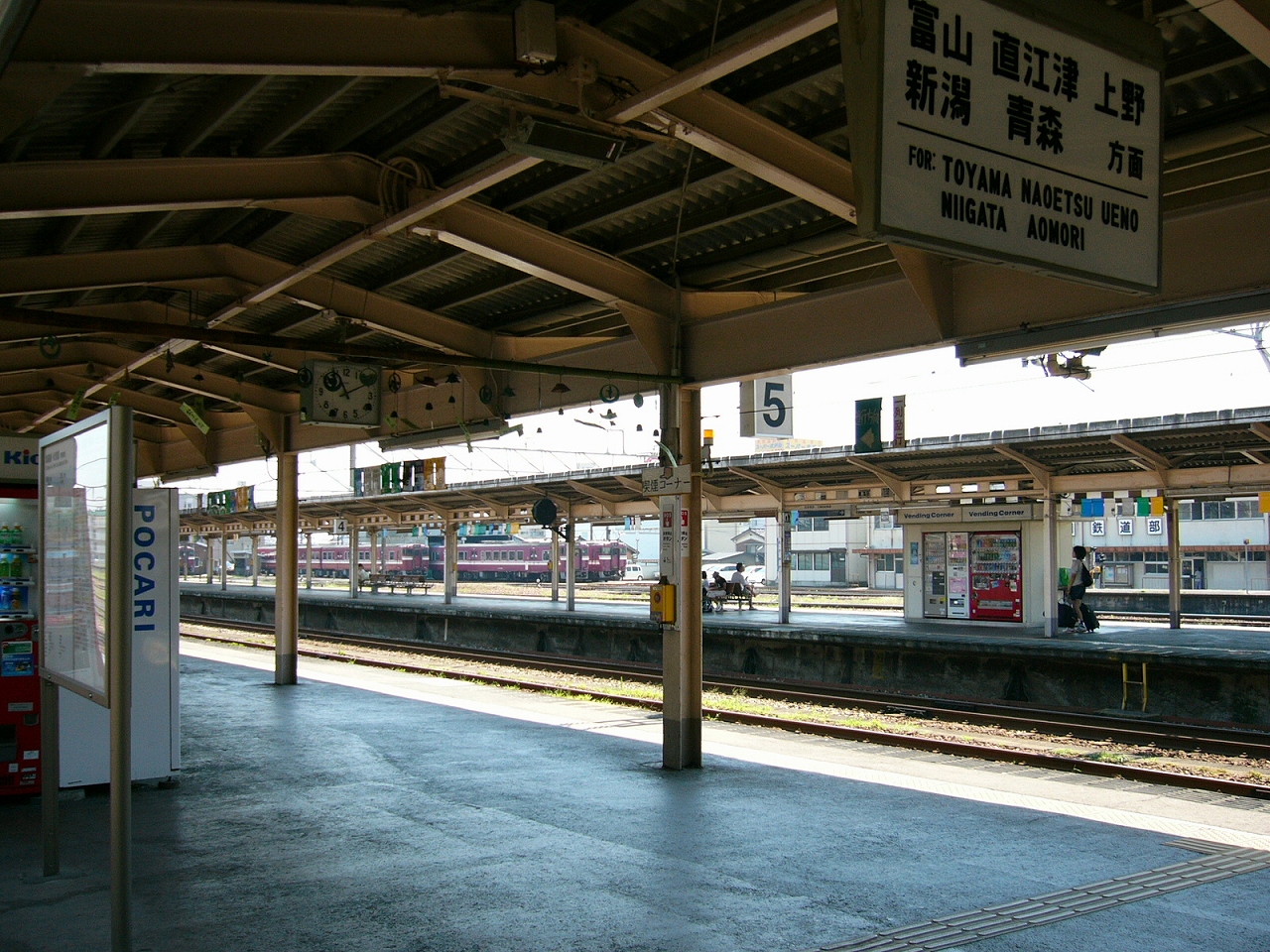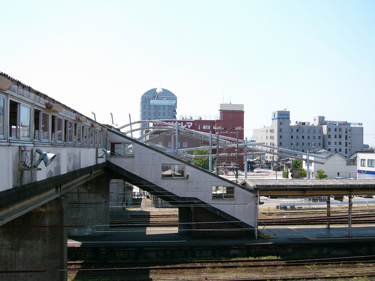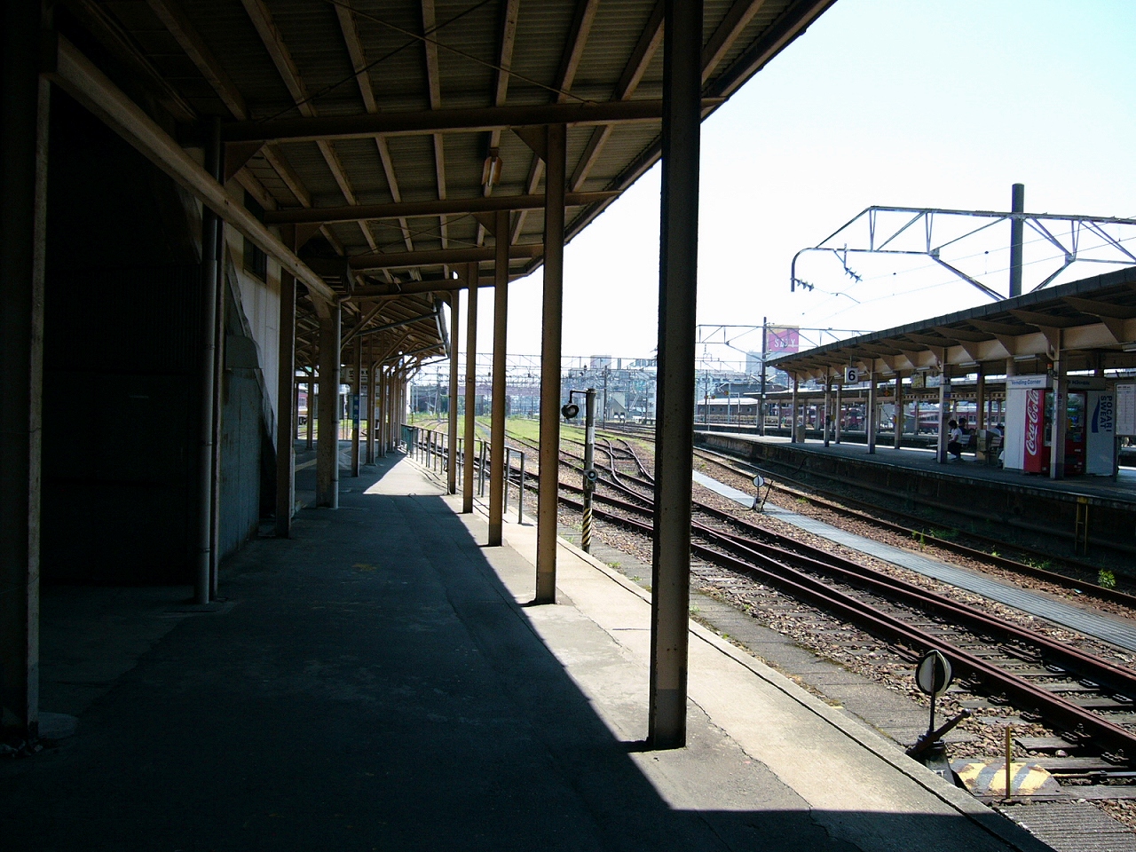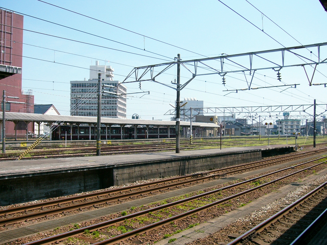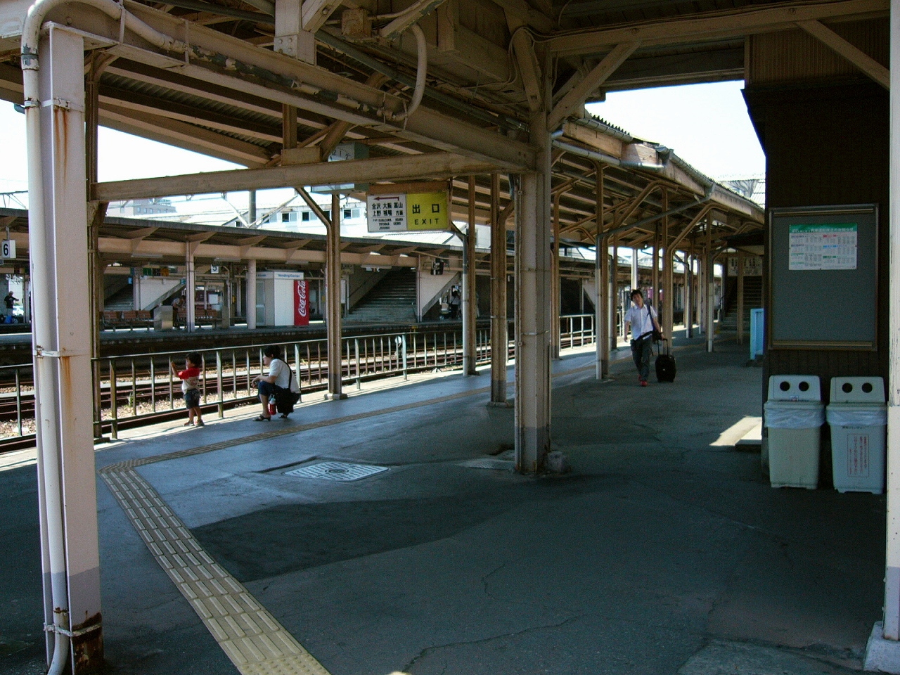 帰りはデパートから跨線橋に直接つながる改札を通ることにしよう。ちょうどもうすぐ下りが着く。近づいていくと改札係に、どの列車に乗るの、と訊かれた。富山方面だと伝えると、やにわ真剣に目を点にして「え、もう行っちゃったんじゃない?」そして切符を私に手渡して、「あ。やっちゃったな。」と、にやりとするのである。私は期待に応えるように走って自動ドアをくぐり、跨線橋に入った。冷房が切れてむっと空気がよどんでいる、その中、下方でごうんと富山行きの滑り出たのが、見えた。次の下りは何十分も後だった。しまった。そもそも本線なのにお昼の普通列車が思いのほか少ないのはなんでだ。