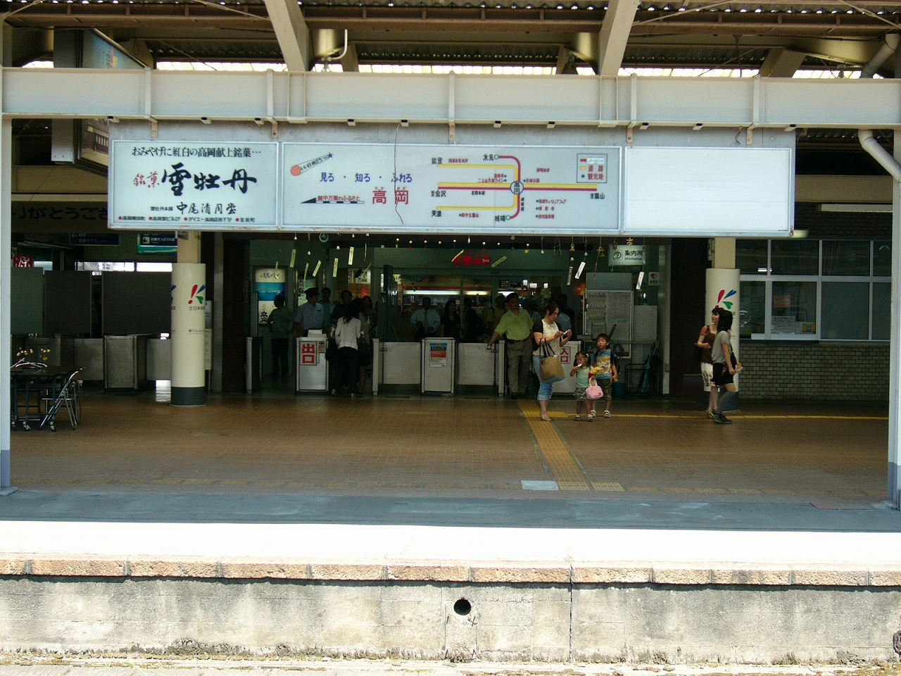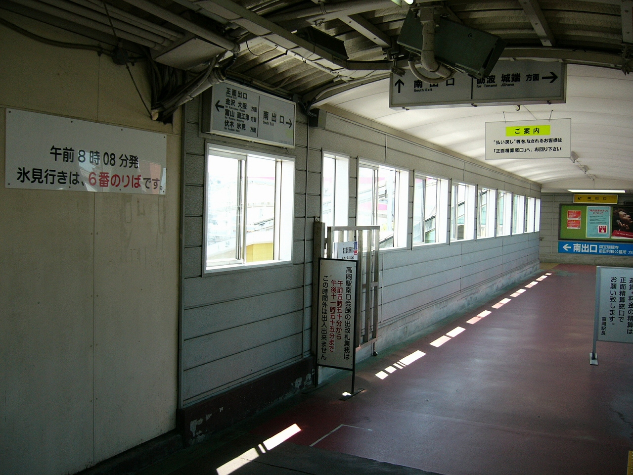 氷見線ホームから平面移動して、改札口前へ。ラッチの並びの前は広場になっていて多くの人を捌けそう。この場所は線路に接しているのだが、乗り場ではない。昔は使ったことがあったそうだ。子供を抱いた中年男性が、子に列車を見せていた。いろんな駅で見られる光景、しかし高岡なんて見られる列車に関しては贅沢なもので、たぶんこの子はほかの駅ではまったく物足りなくなるだろう。