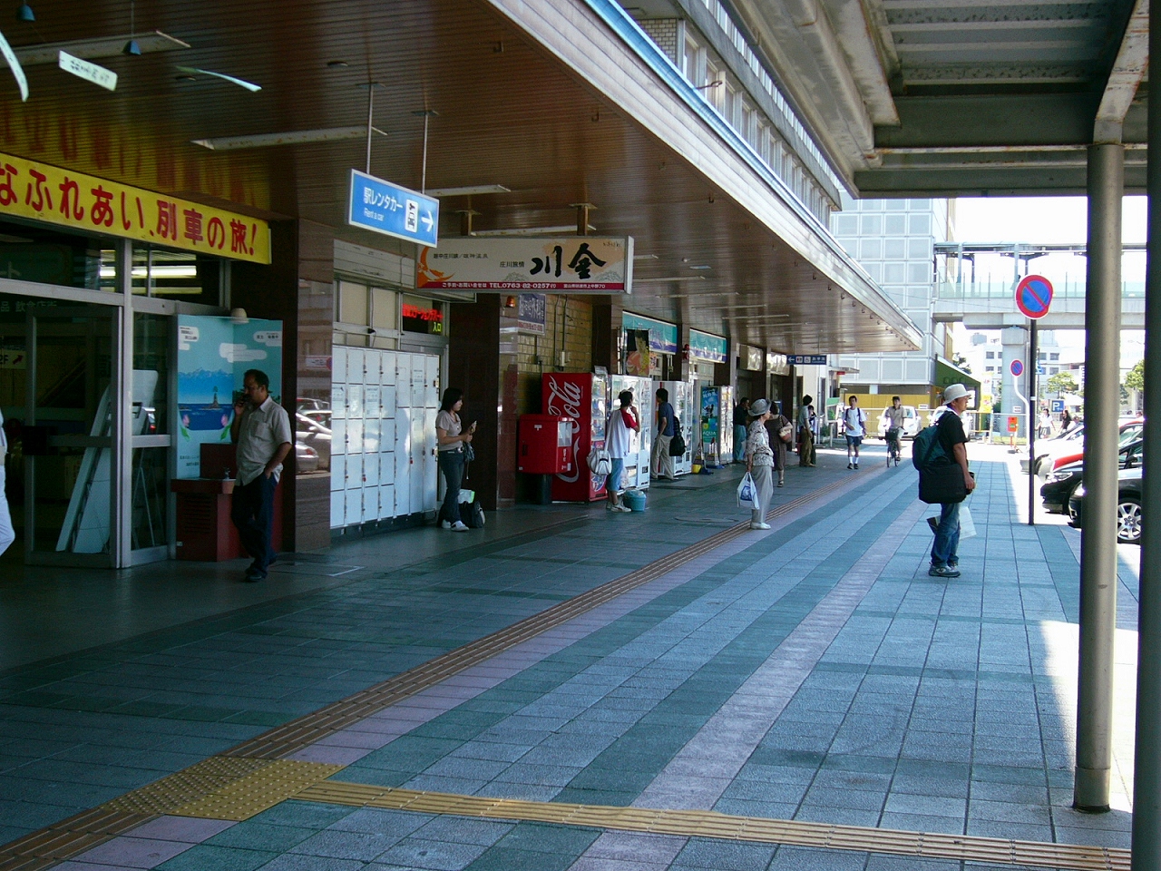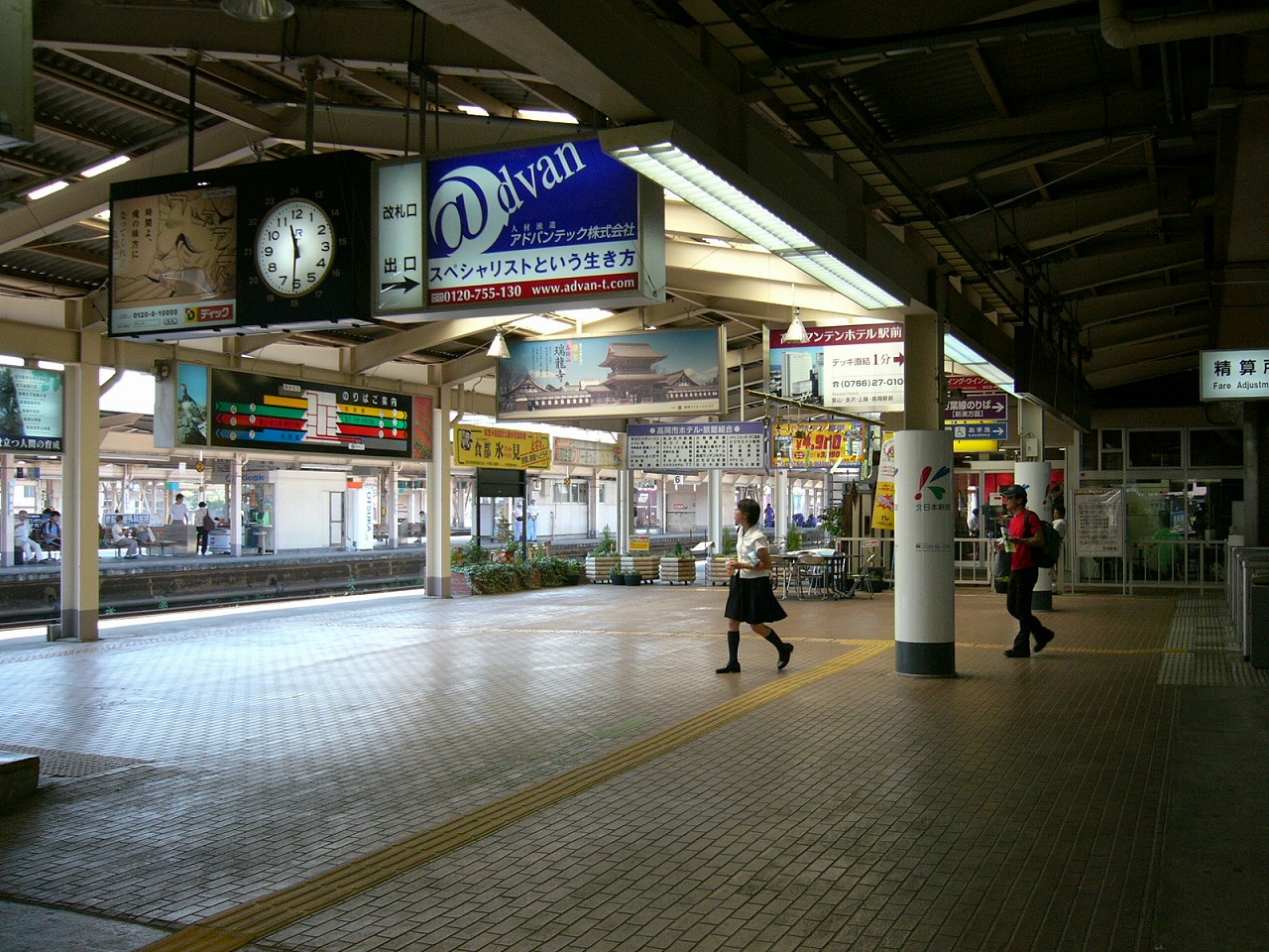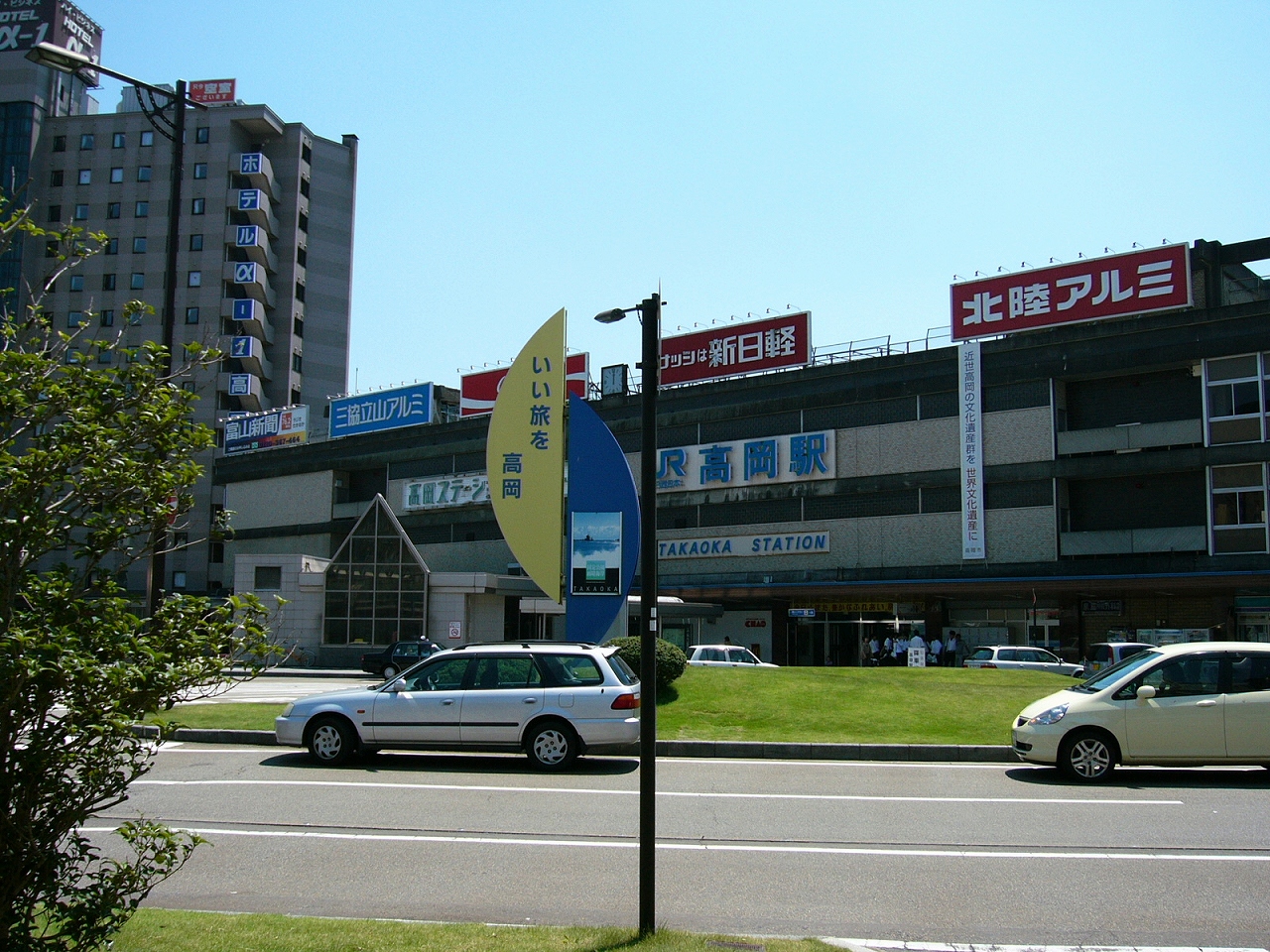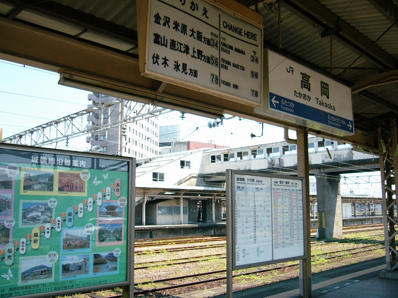 駅には「高岡駅」と壮観な掲示、それがよく見えるところにいると、駅から出たばかりの、短いズボンをはいた40くらいの男性が、また、ほかの若い旅行者が、そして私が、ほぼ同時に撮影し、その短いズボンの男性は、万葉線のりばへと去って行った。これから海を見に行くんだな。単行旅行者の交錯する高岡駅前。