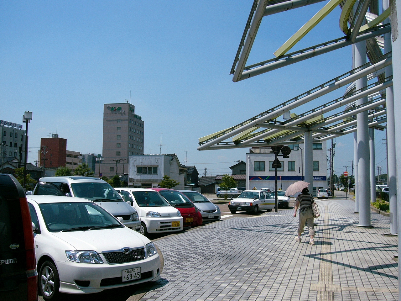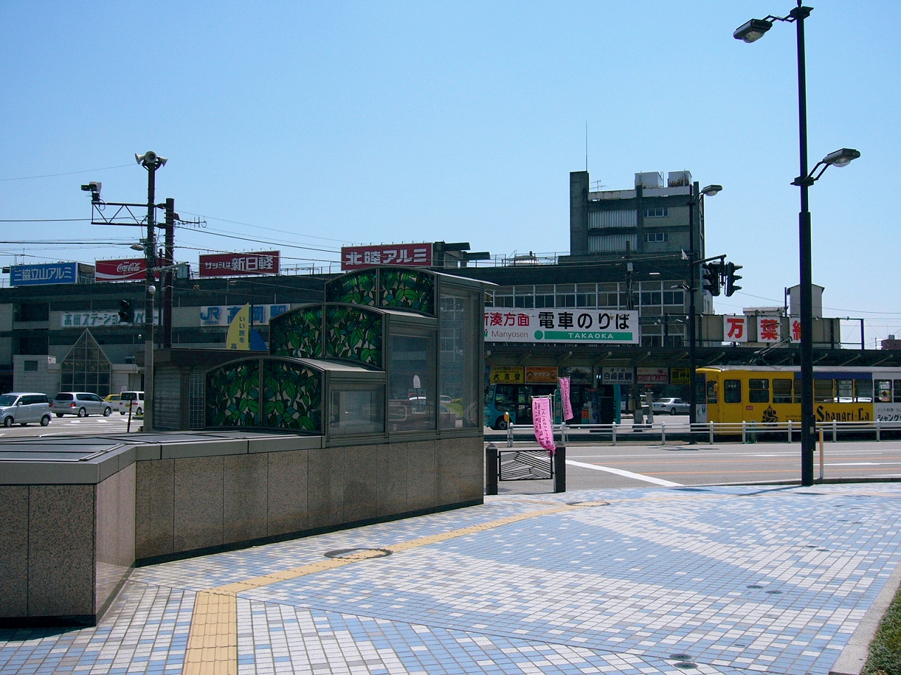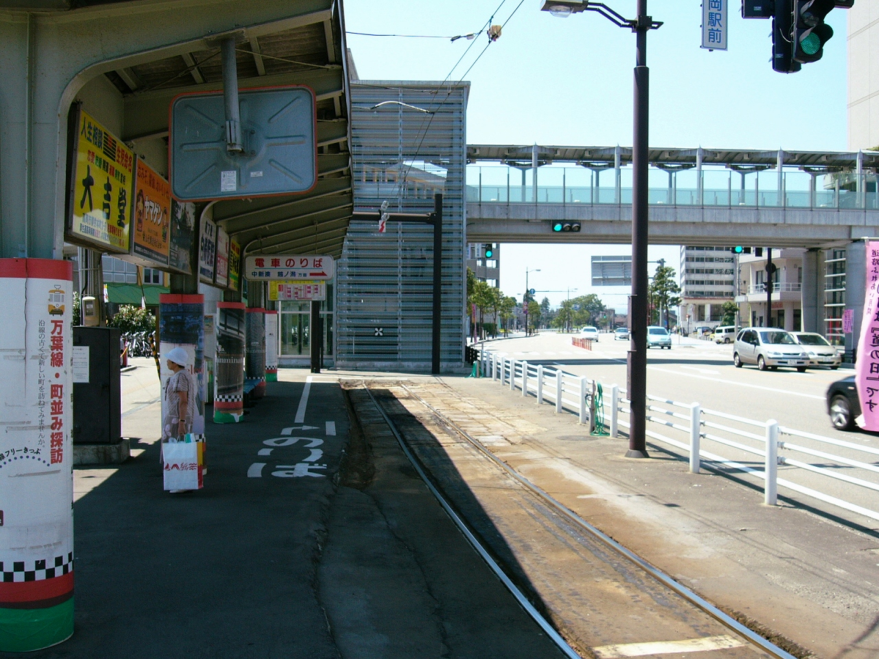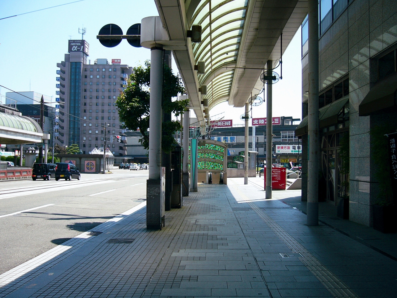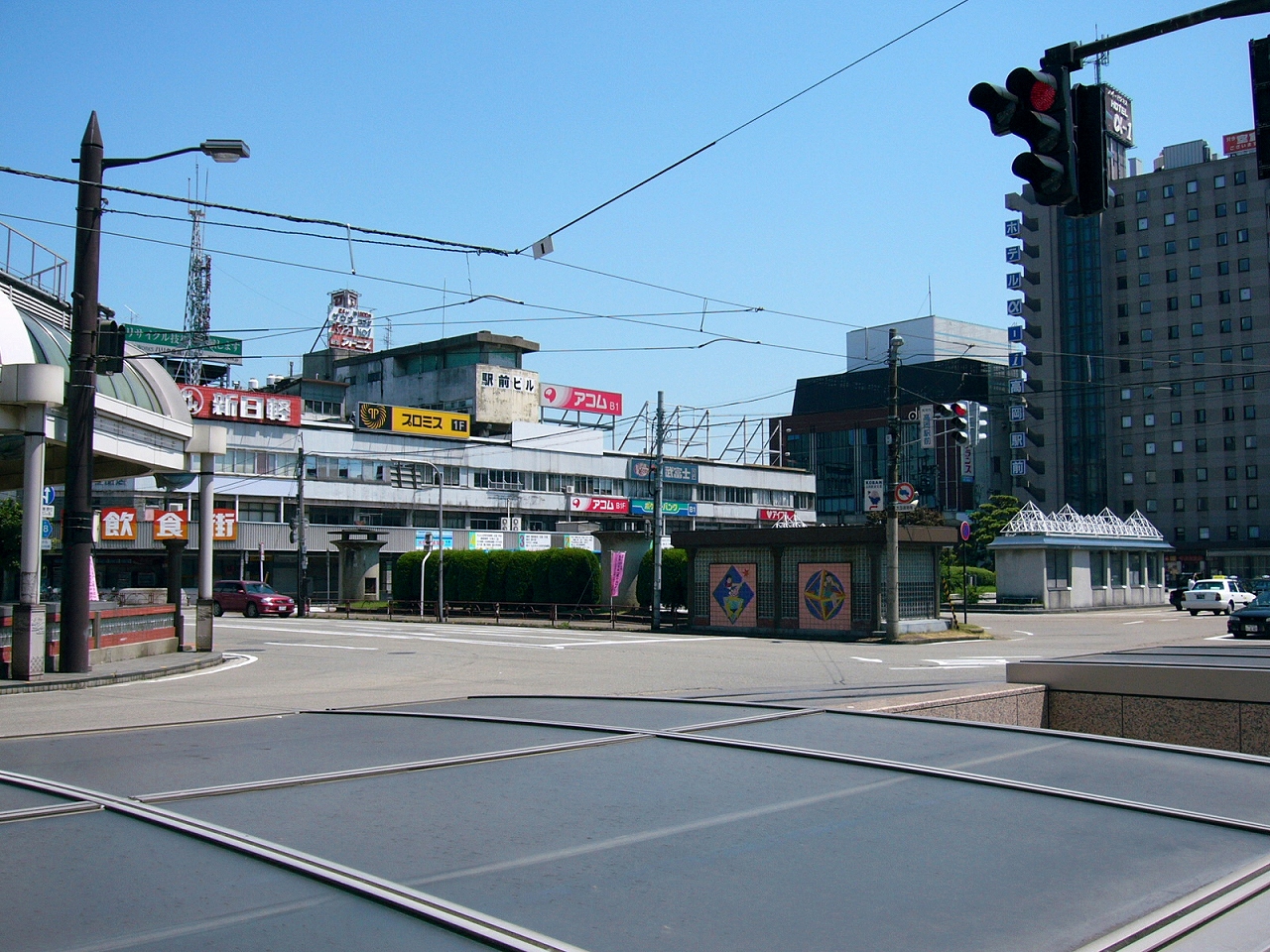 外に出たら出たで、むうっと息苦しい。初めだけかと思ったらそうではなく、ずっと息苦しく、こんな中歩くのが現実だった。暑いけど駅前はすばらしかった。駅ビルの建物そのものはまだなんとか持つとして、斜向かいのアドニスビルは、もうかなり老朽しているのだが、駅前花壇が色鮮やかで、ガラスの新しいビルも建っている。こんなに新旧の混淆の上手なところはないように見えた。なぜか風景が飛び出すように立体的だ。ビルはそうしてだめなものもあるが、転回場はきちんと整備されているし、駅舎の軒下からそのまま入れる地下街への大階段など、すでに都会の気風を有している。そして路面電車の小さな万葉線乗り場。離れいてるのに駅を出てすぐ、すぐ目に付く。ちょっと歩いて覗きに行くと、がたがたのコンクリートに二条のレールが埋まっている。そして路面を這うようにポートラムがカーブして走り去るのでした。新しきものと古きもの。絶妙、とはこのことかしら。
