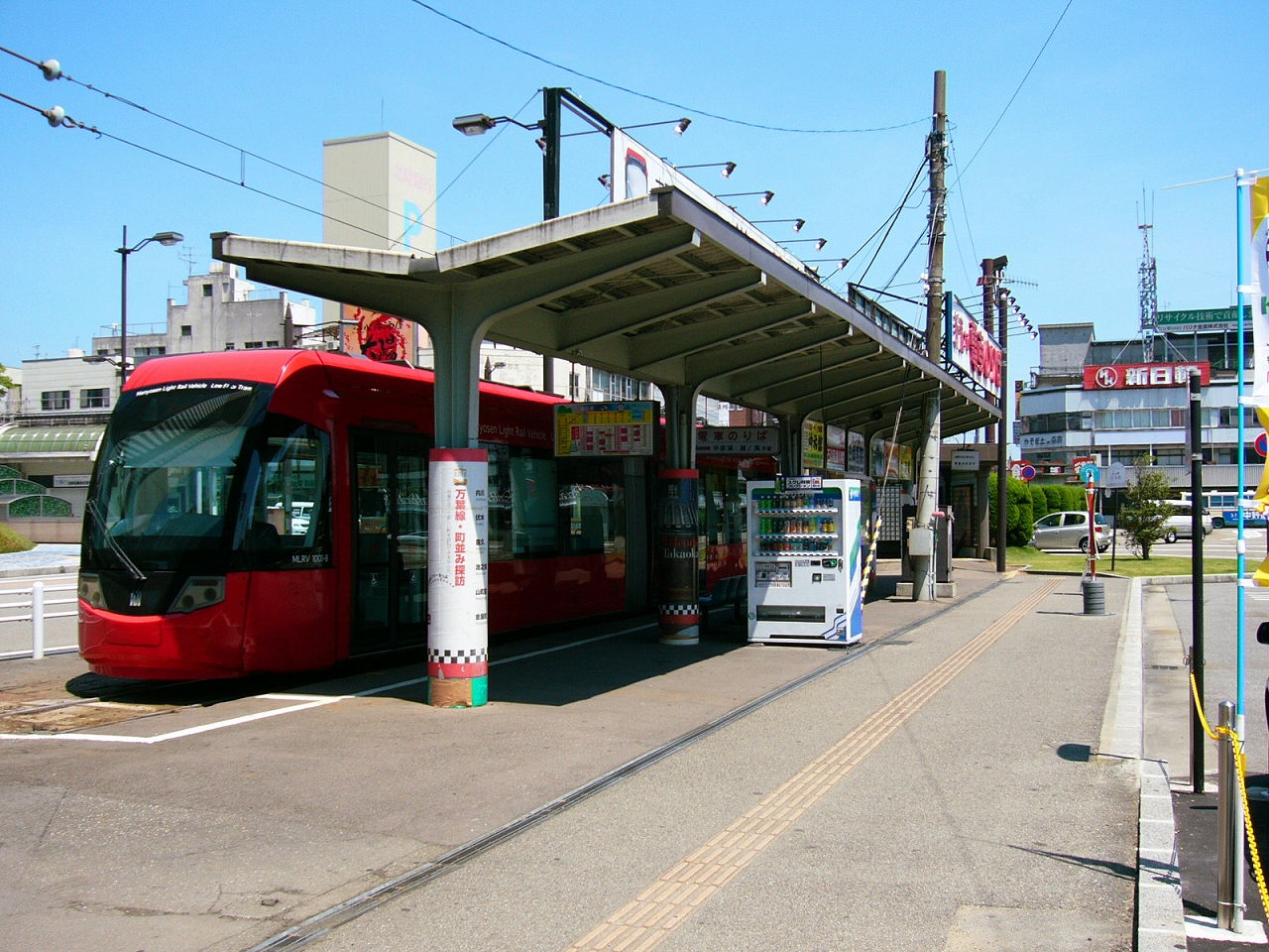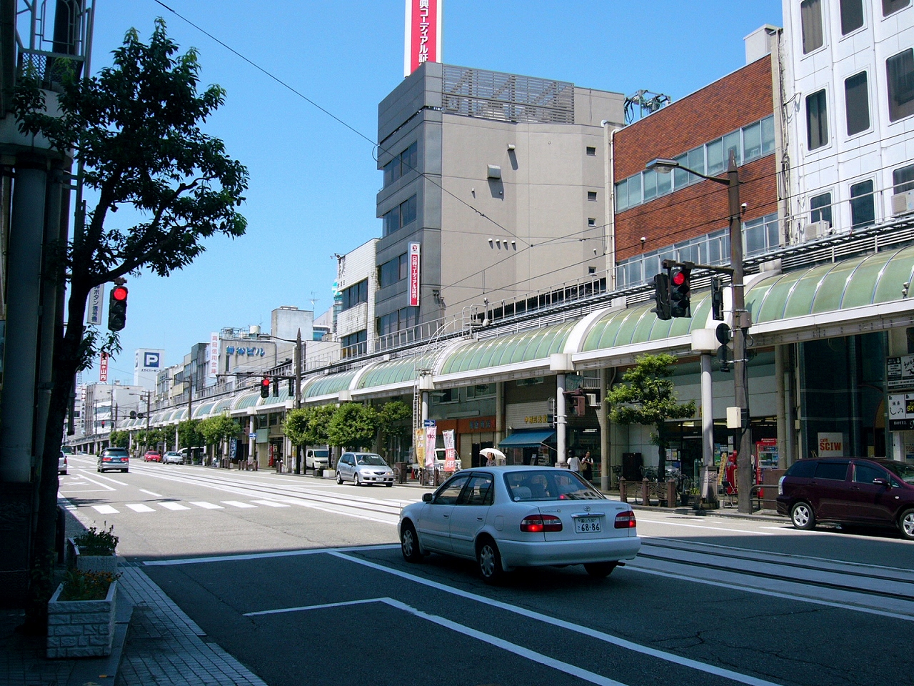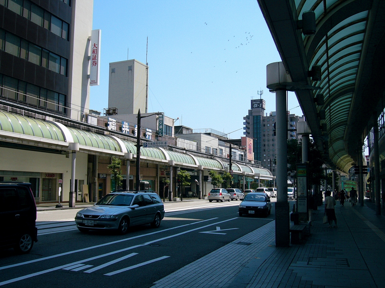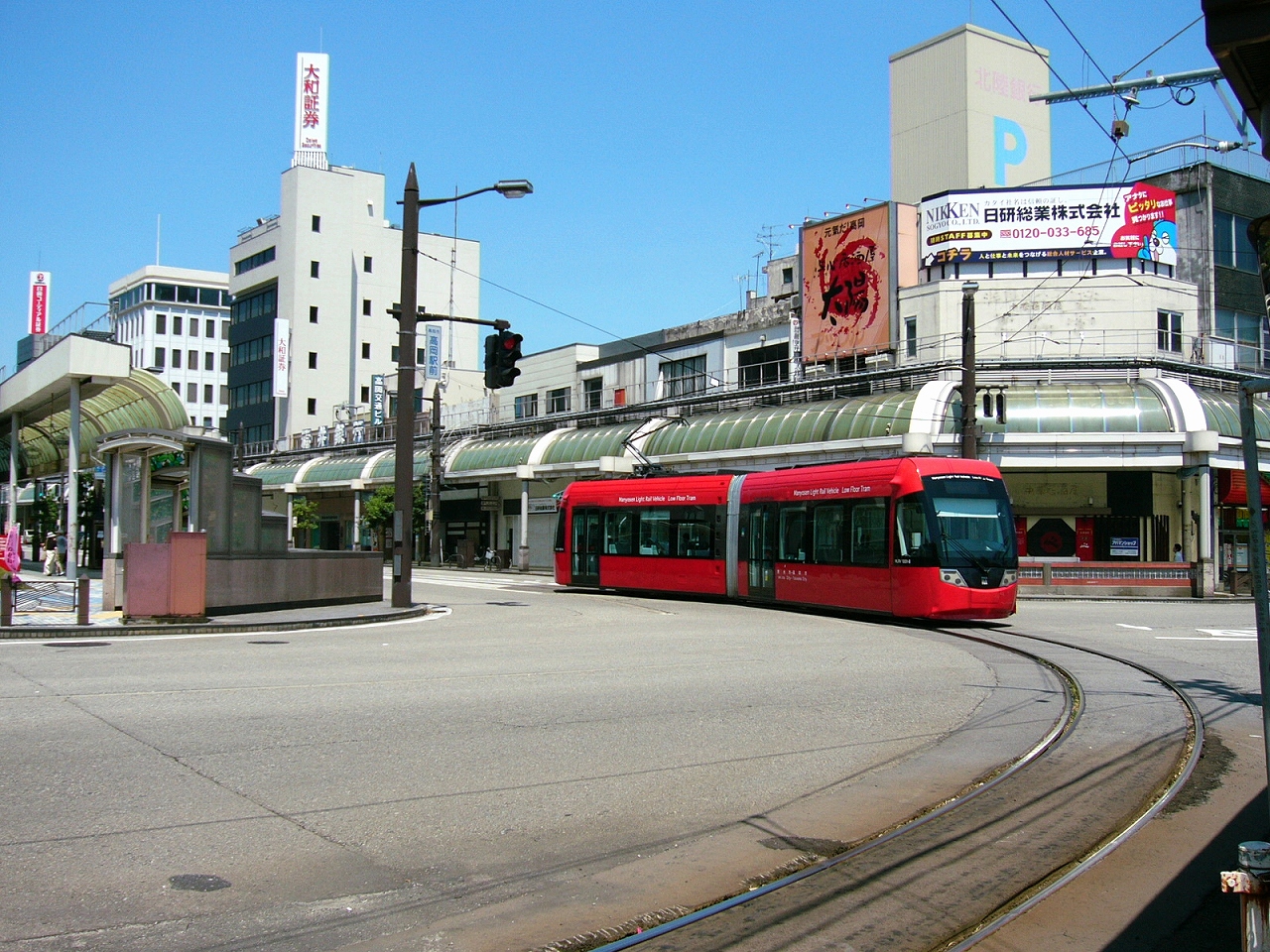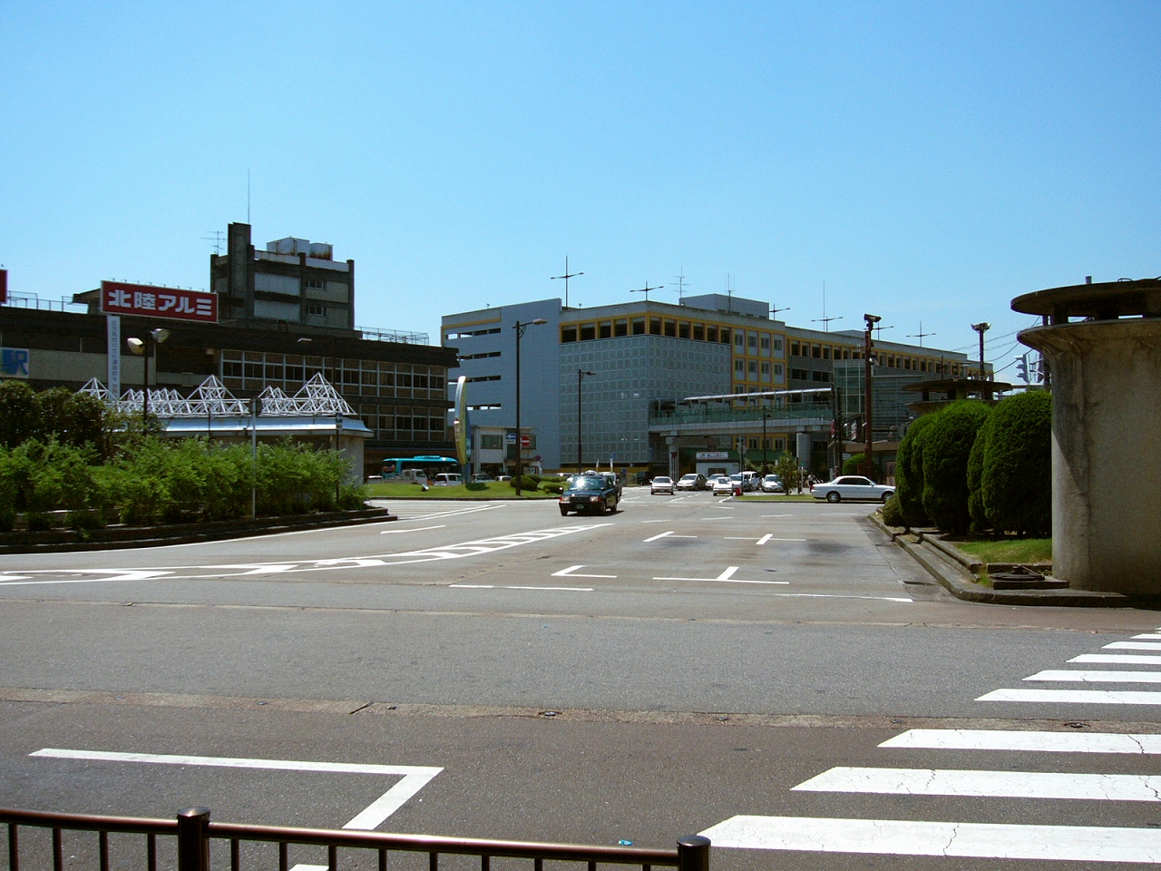 外に出たら出たで、むうっと息苦しい。初めだけかと思ったらそうではなく、ずっと息苦しく、こんな中歩くのが現実だった。暑いけど駅前はすばらしかった。駅ビルの建物そのものはまだなんとか持つとして、斜向かいのアドニスビルは、もうかなり老朽しているのだが、駅前花壇が色鮮やかで、ガラスの新しいビルも建っている。こんなに新旧の混淆の上手なところはないように見えた。なぜか風景が飛び出すように立体的だ。ビルはそうしてだめなものもあるが、転回場はきちんと整備されているし、駅舎の軒下からそのまま入れる地下街への大階段など、すでに都会の気風を有している。そして路面電車の小さな万葉線乗り場。離れいてるのに駅を出てすぐ、すぐ目に付く。ちょっと歩いて覗きに行くと、がたがたのコンクリートに二条のレールが埋まっている。そして路面を這うようにポートラムがカーブして走り去るのでした。新しきものと古きもの。絶妙、とはこのことかしら。