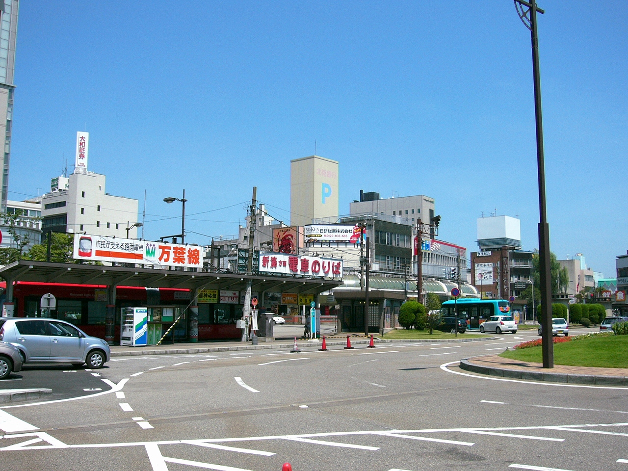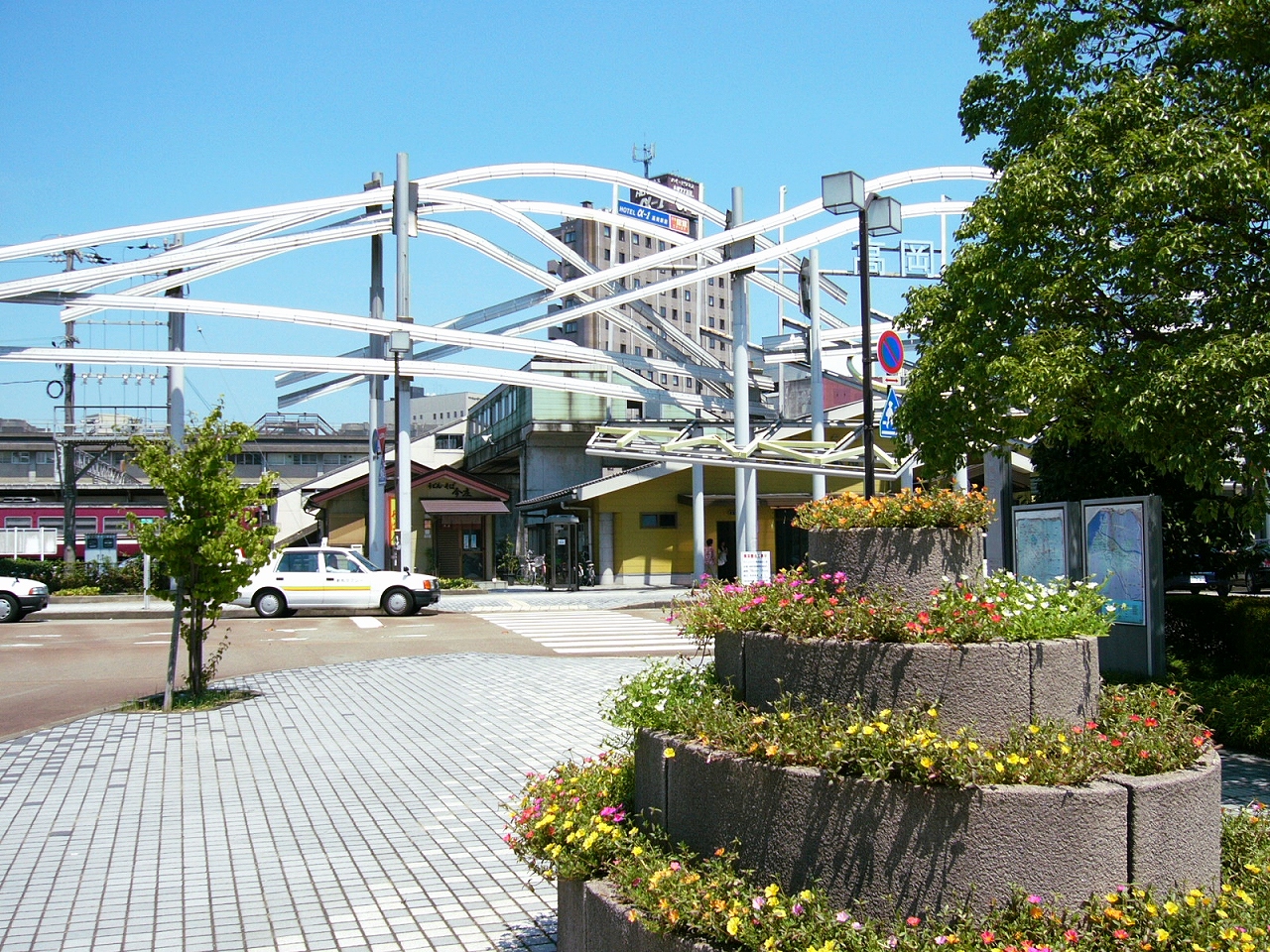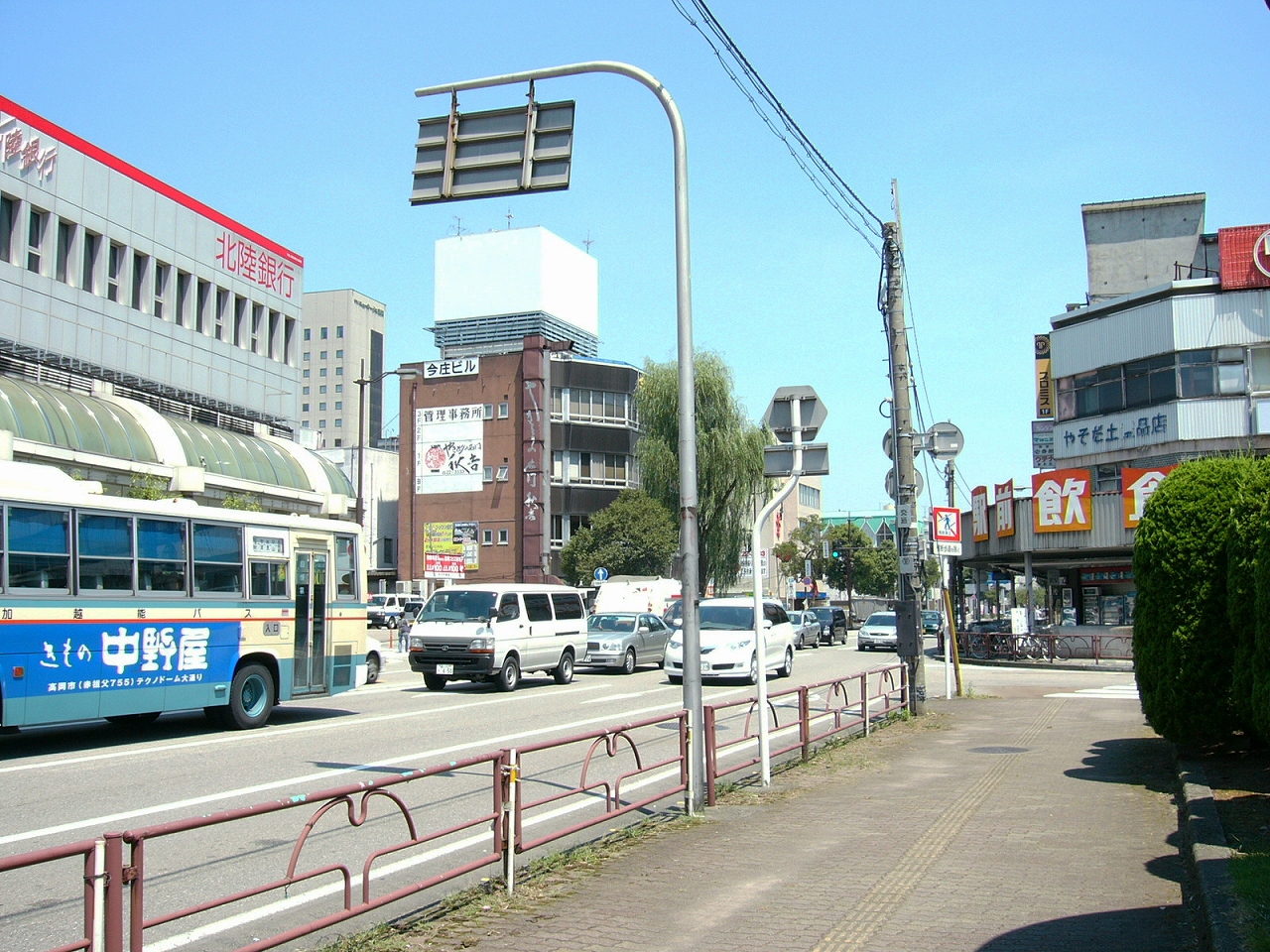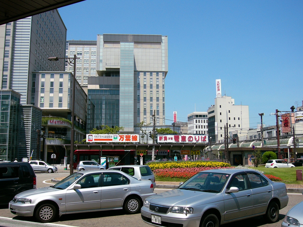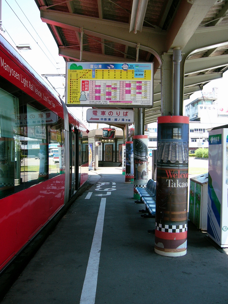 外に出たら出たで、むうっと息苦しい。初めだけかと思ったらそうではなく、ずっと息苦しく、こんな中歩くのが現実だった。暑いけど駅前はすばらしかった。駅ビルの建物そのものはまだなんとか持つとして、斜向かいのアドニスビルは、もうかなり老朽しているのだが、駅前花壇が色鮮やかで、ガラスの新しいビルも建っている。こんなに新旧の混淆の上手なところはないように見えた。なぜか風景が飛び出すように立体的だ。ビルはそうしてだめなものもあるが、転回場はきちんと整備されているし、駅舎の軒下からそのまま入れる地下街への大階段など、すでに都会の気風を有している。そして路面電車の小さな万葉線乗り場。離れいてるのに駅を出てすぐ、すぐ目に付く。ちょっと歩いて覗きに行くと、がたがたのコンクリートに二条のレールが埋まっている。そして路面を這うようにポートラムがカーブして走り去るのでした。新しきものと古きもの。絶妙、とはこのことかしら。