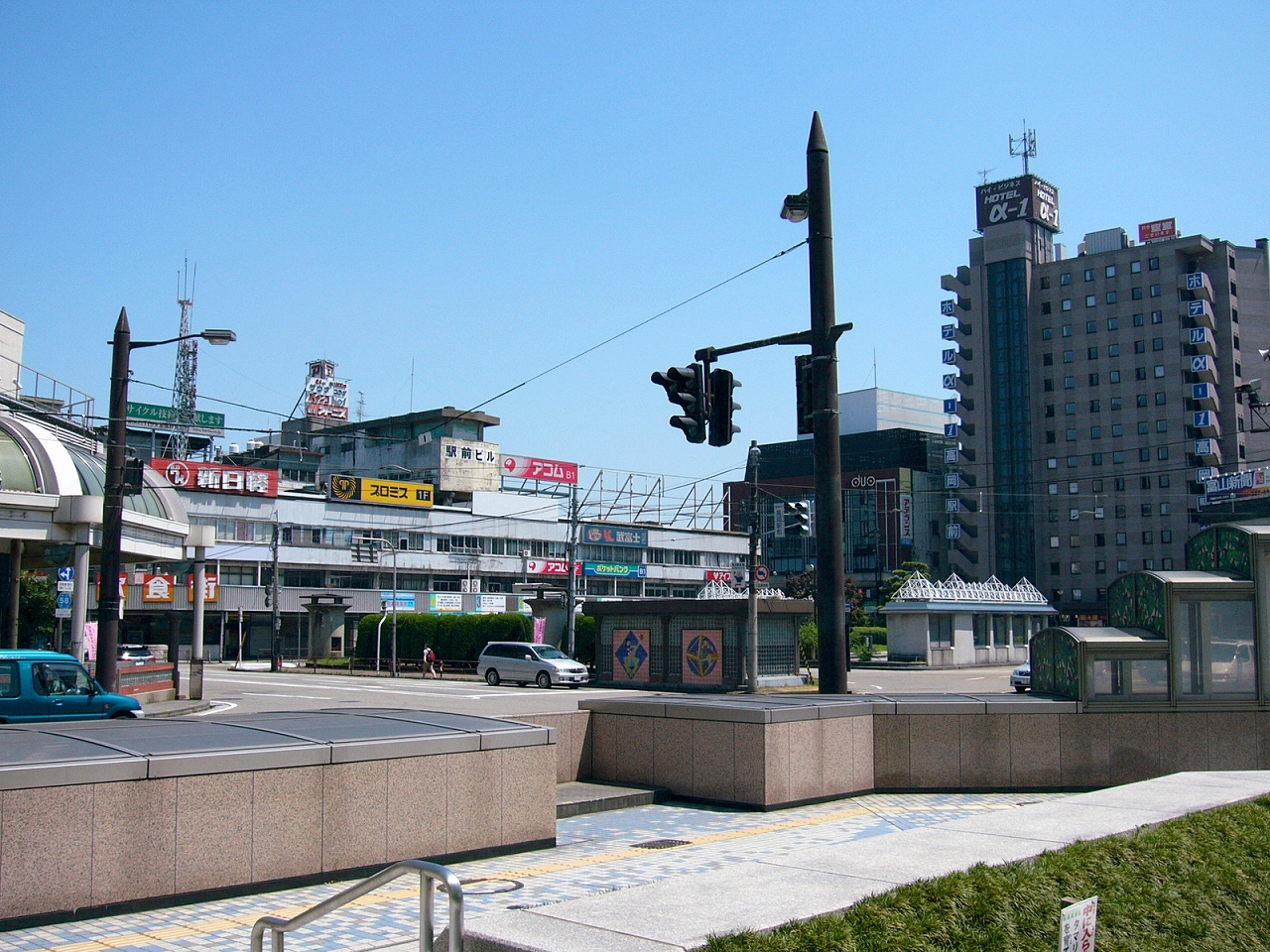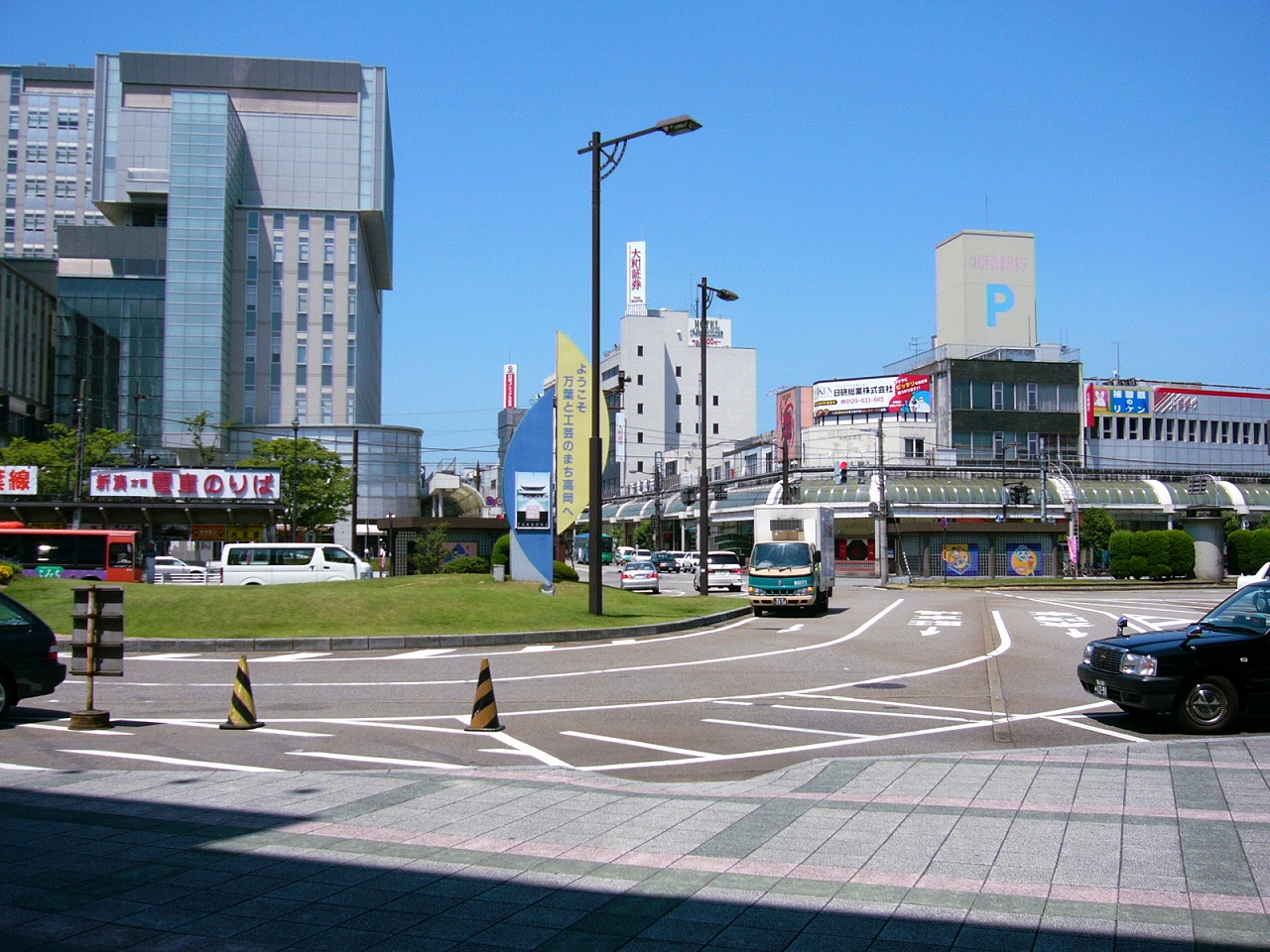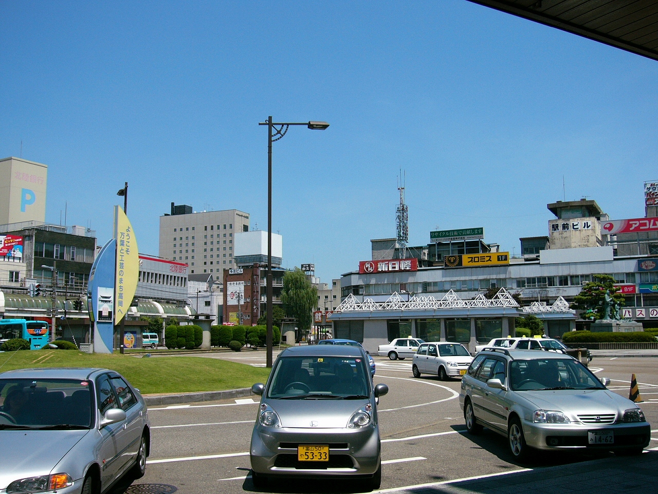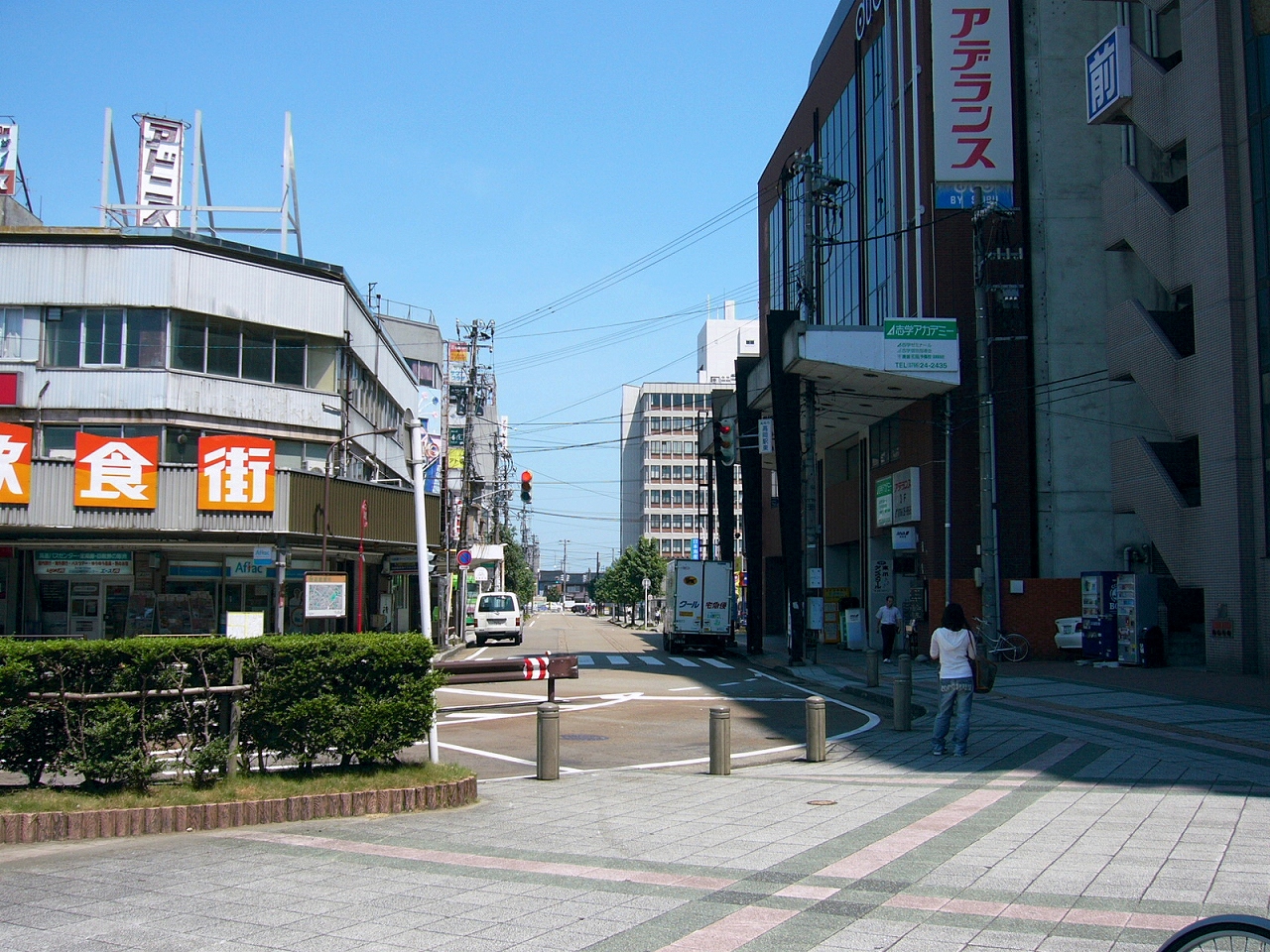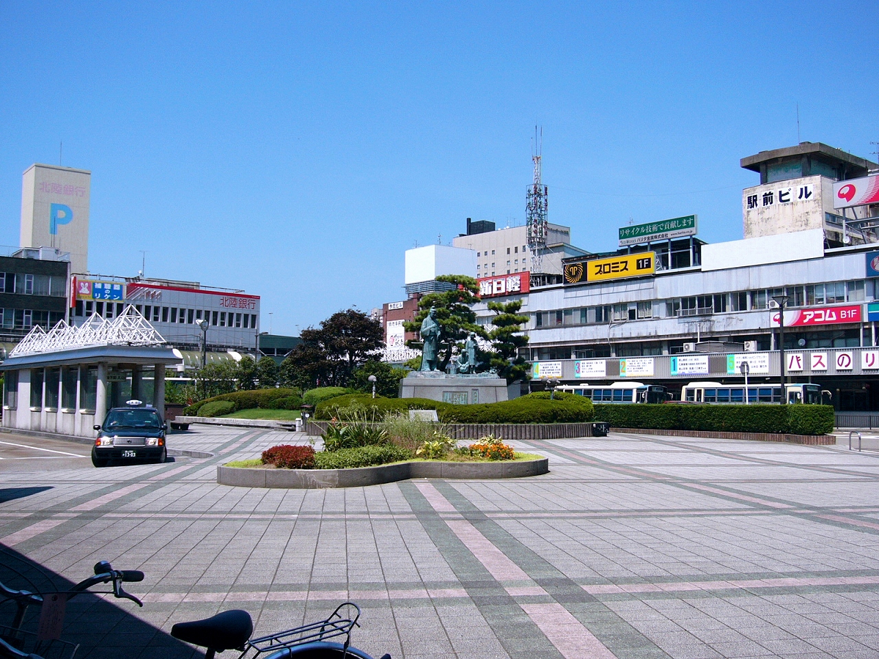 外に出たら出たで、むうっと息苦しい。初めだけかと思ったらそうではなく、ずっと息苦しく、こんな中歩くのが現実だった。暑いけど駅前はすばらしかった。駅ビルの建物そのものはまだなんとか持つとして、斜向かいのアドニスビルは、もうかなり老朽しているのだが、駅前花壇が色鮮やかで、ガラスの新しいビルも建っている。こんなに新旧の混淆の上手なところはないように見えた。なぜか風景が飛び出すように立体的だ。ビルはそうしてだめなものもあるが、転回場はきちんと整備されているし、駅舎の軒下からそのまま入れる地下街への大階段など、すでに都会の気風を有している。そして路面電車の小さな万葉線乗り場。離れいてるのに駅を出てすぐ、すぐ目に付く。ちょっと歩いて覗きに行くと、がたがたのコンクリートに二条のレールが埋まっている。そして路面を這うようにポートラムがカーブして走り去るのでした。新しきものと古きもの。絶妙、とはこのことかしら。