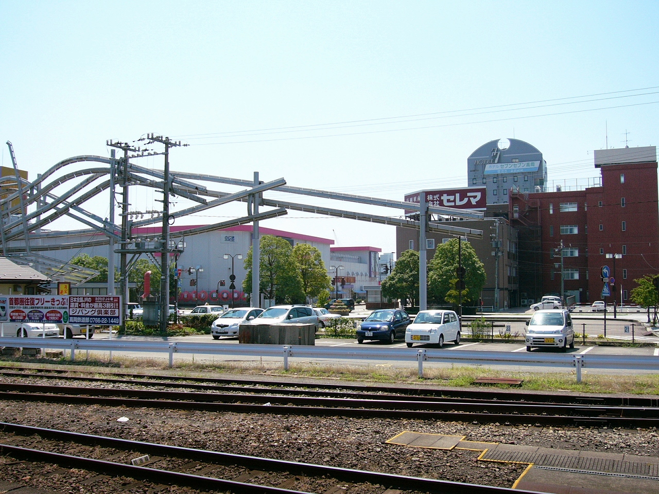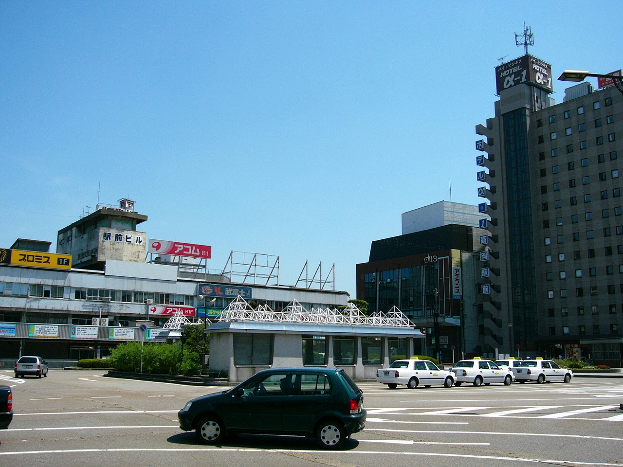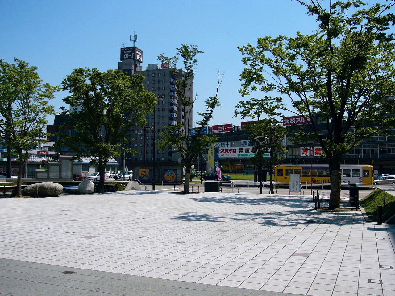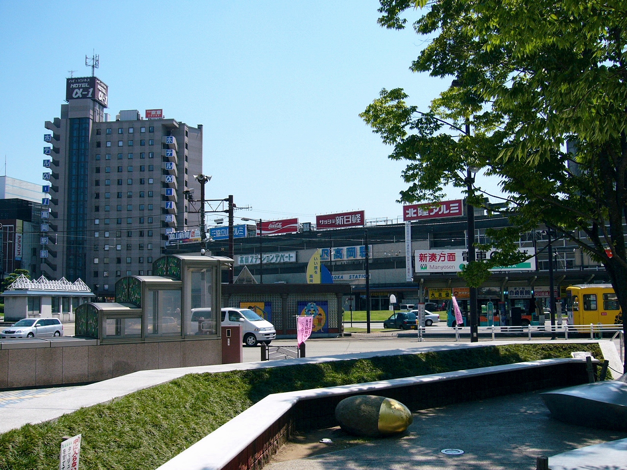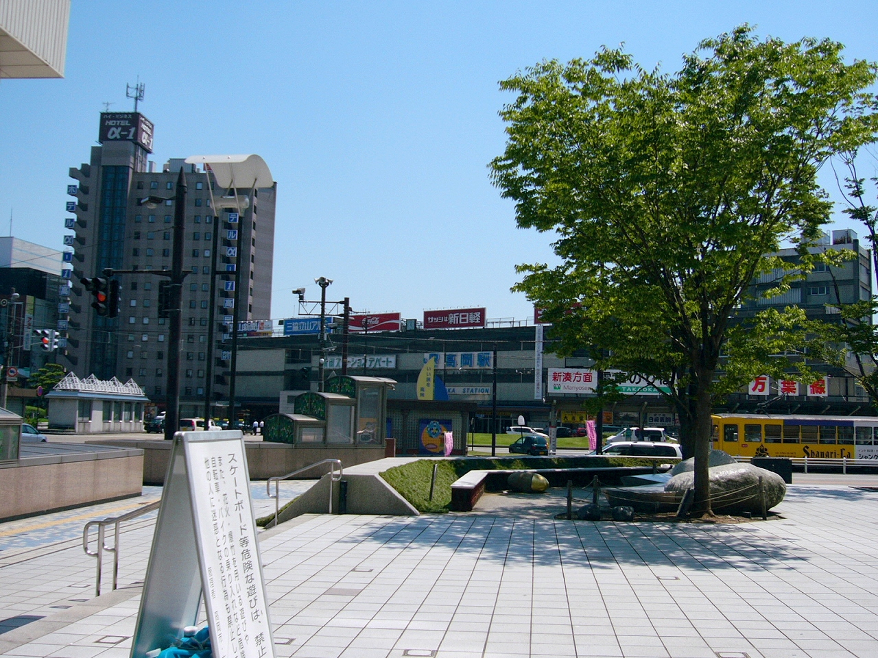 外に出たら出たで、むうっと息苦しい。初めだけかと思ったらそうではなく、ずっと息苦しく、こんな中歩くのが現実だった。暑いけど駅前はすばらしかった。駅ビルの建物そのものはまだなんとか持つとして、斜向かいのアドニスビルは、もうかなり老朽しているのだが、駅前花壇が色鮮やかで、ガラスの新しいビルも建っている。こんなに新旧の混淆の上手なところはないように見えた。なぜか風景が飛び出すように立体的だ。ビルはそうしてだめなものもあるが、転回場はきちんと整備されているし、駅舎の軒下からそのまま入れる地下街への大階段など、すでに都会の気風を有している。そして路面電車の小さな万葉線乗り場。離れいてるのに駅を出てすぐ、すぐ目に付く。ちょっと歩いて覗きに行くと、がたがたのコンクリートに二条のレールが埋まっている。そして路面を這うようにポートラムがカーブして走り去るのでした。新しきものと古きもの。絶妙、とはこのことかしら。