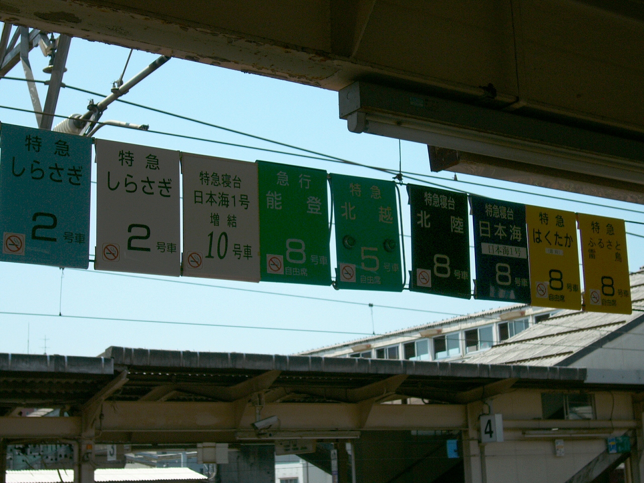 その遠いホームの人模様も覗けて、里帰りの人や部活遠征の中学生でいっぱいなのだが、このホームを端の方まで行くとそのような雑踏も見えなく、また聞こえなくなりそうになって、いろんな色の特急号車札がぎっしり、静かに掛かっている。雷鳥、しらさぎ、サンダーバード、日本海、きたぐになど。それぞれ編成が違うだけで色が違うように、実にいろいろな列車旅を鮮やかに分かけて想像せよといわれているようだ。ただ見つけやすいというだけでさして興味を持たなくても、立って並んで退屈なときは、その札から何かを考えしまう。