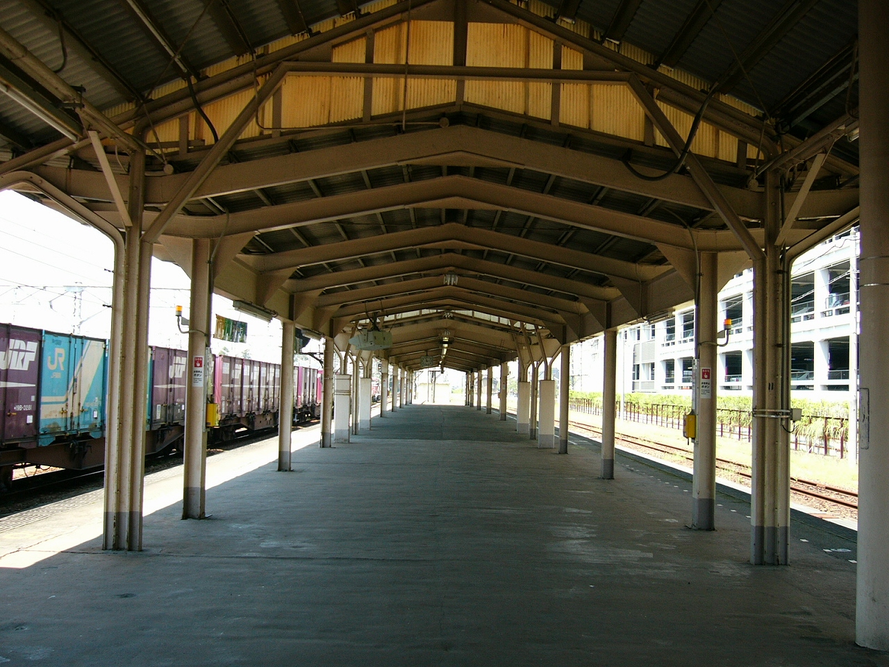 広い跨線橋では、脇に回転焼きでも出店できそうだ。窓一つ一つ、構内が違って見渡せる。中線がいくつも並んだかと思うと、あるところはおもしろい紡錘形になり、あるところは斜めで中線を集めていた。客車や貨物、機関車、連結や機回しなのであろうが、それは想像というより、そのような想像がないと、この風景は異様で、解(げ)せないものなのだった。その意味で、もはやこの風景だけで遺産めいたものとなっている。しかし今でも使われているものがあって、貨物や旅客編成が滞泊しているのを見かけた。