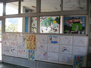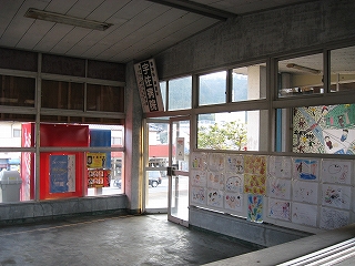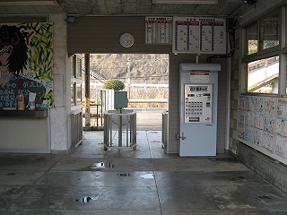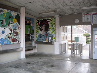 待合室内の様子。児童たちの絵が人をほっとさせるほど、すさんだ駅である。 しかし待合室内はきれいに清掃されていた。
