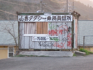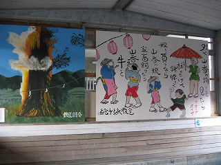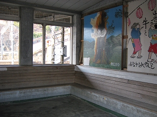 気密な跨線橋内の、出口という真っ黄色の、文字列ゆえ隻眼を聯想する大看板に怖がりながらも、階段を下りてそそくさと駅舎に入った。ぽっかりとした石造りの空間に入り、不思議さに打たれ、口を半開きにして見上げるように周りをゆっくり眺めまわした。出入りするところはどこもかしこも戸がないかあっても開けっぴろげで、外気が入り込み、風化が進行しつつあるかのようだった。重たいガラス開き戸の待合室もあるが、照明はなく真に暗くて、新しいめの壁画がせめてもの救いだった。ある踊りを描いた筆絵には、「嫁を貰うなら山香の娘、家畜飼うなら山香の牛を」とあった。牛と列記するところに、農村の凄みを感じずにはおれなかった。また、立石の夏祭りを描いた絵もあった。今の季節からは遠いが、その落ち着いた絵は、こんなところでは、やっぱり祭りがいちばんの楽しみだと思わせた。毎年、祭りの前日の暑い夜、抑えつけられる日々から逃れさせる、数少ない楽しみを夢を見て眠る子供がいるかもしれない。