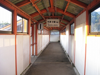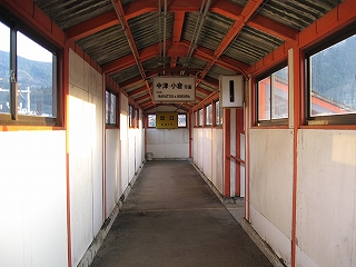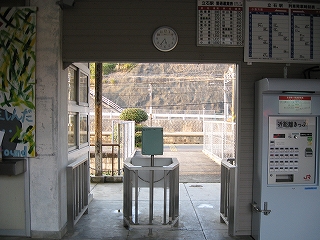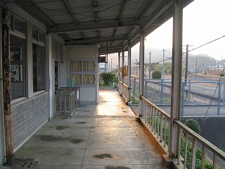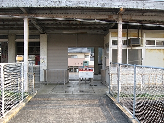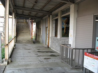跨線橋の階段は乗り場ではなく回廊から入るようになっていた。 上りホームへは、かつてはこの跨線橋を使わなければならなかったが、 駅舎前の一線が廃止されたため、橋で直接行けるようになった。