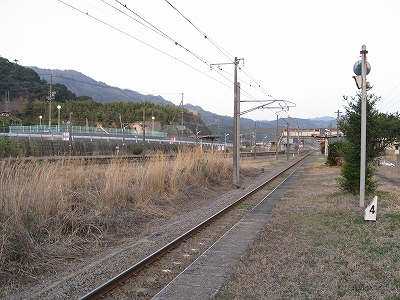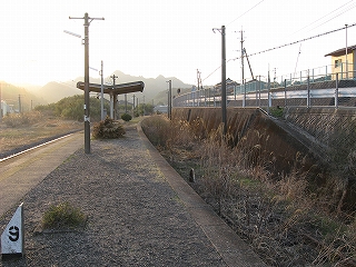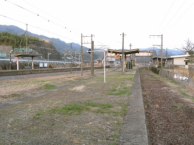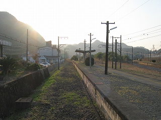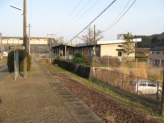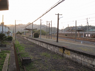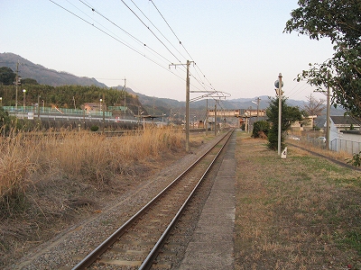 舗装していないホームの土に足をつけ、夕暮れながらも春らしいつんとした外気に触れ合うとほっとし、自分を取り戻せた。ホームが逸れていくだけに、歩くにつれ駅舎と離れていくのが実感でき、そのしだいにひらいていく間の土地からは、かつての駅の忙しさが立ち昇った。そういう用地越しに無人とは思えぬ規模の駅舎が駅名標という名札を提げて佇んでいる。私はこの駅に引きこまれつづけ、中山香に行く予定を取りやめ、ここでの滞在を延ばした。私には珍しいことだった。息を呑みながら立石峠の方にまたずんずん歩く。足元では枯れ草をばりばり折る音が常にして、ちょっと目立ち過ぎるのではないかと気にかかった。叢と廃倉庫で駅舎の視線から隠れると、はっきりと単線の様相になった。ホームあるのに駅とも鉄路の途中とも付かないこんなところに、列車で着いて、降り立ったら厭だな。さいわい、もうここまで来るような長い列車はここに停まらないけど。さてこんな端まで来て、特急が通過したらどう思われるかわからしないと、足元の音に気を使って小走りにそこから去ると息が切れた。駅舎が見え出すと急に安心した。歩行が緩まった。