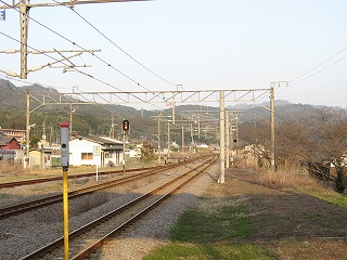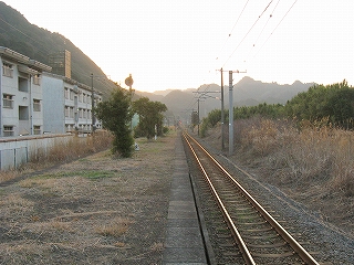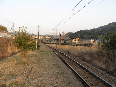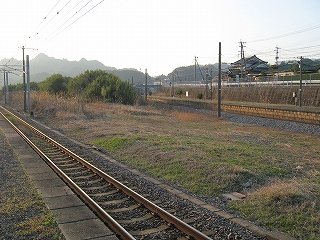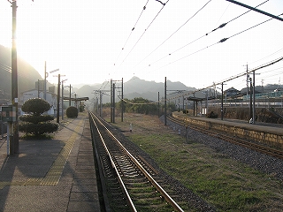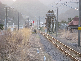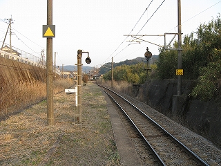 ホームの先端に立って。相変わらずすごい山容だ。 しかし、実は立石峠まではあと少し。この駅の標高がすでに110-120m. 峠は標高140mほど。