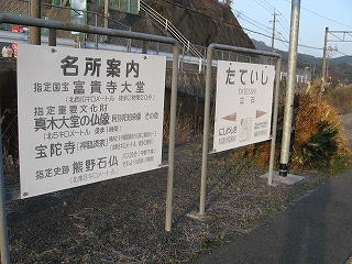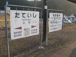駅名標と名所案内。磨崖仏と立石という地の名が嵌りすぎている。
