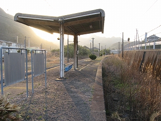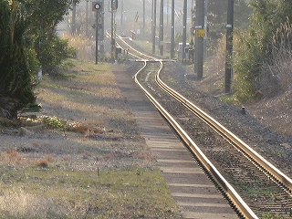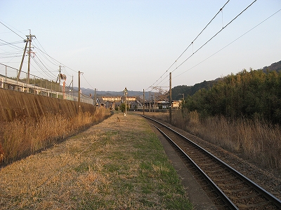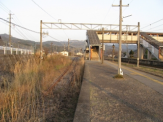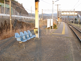 ここは二つの山地に挟まれた薄い谷の地形だが、ぜんたい平地は十分あり、構内にしてはその土地はかなり広いもので、自動車の走行音もほとんど聞こえない、枯れすすきの群がるようなところだった。地図では国道10号がすぐ裏手を走っているように書いてあり騒々しいのを想像するが、代替道路ができたらしく、まったくといっていいほど通りはない。こうして構内が広いのは、最も駅舎から離れ、裏手に近い下り線だけが、あさっての方向に湾曲していっているからで、まさに上下線は当駅で、ばらばらに分かれて、立石峠を、越えるのだった。当然その下りホームも、湾曲していっているのが、確かによく見て取れたが、そのことにほとんど違和感は沸かないのは、廃れ寂れ切っていて、風景に、融け込んでいたからだった。本当に、構内には、自分と夕日以外、誰も見当たらない。その湾曲ホームも、椅子や錆びた駅名標は置いているが、本質は、土台だけのように思われるものだった。