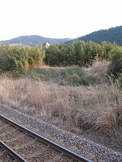 上下線の間にある倉庫群と城山。