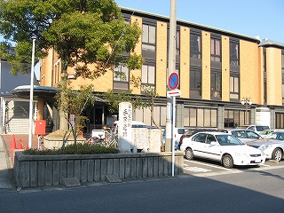 栗東市商工会館。手原遺跡を示す石碑がある。