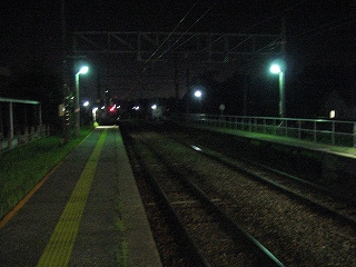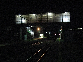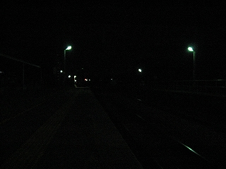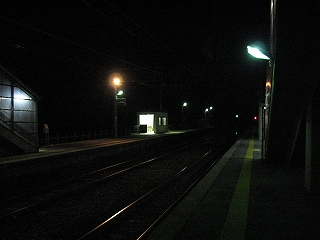 そんな冷涼な空気の中、残っている人が一人いる。迎えの来る気配は、少しもない。四十前くらいで眼鏡をかけスーツ姿の落ち着いた人だが、純朴な感じだった。駅前は店などない集落で、駅舎は、ほかの家々と同じようにして、道に面していた。そして闇の冷たい空気の中、新しい街灯が路面と新緑の街路樹を照らしており、そんな中 二人して立っているのは変だったが、その人は私のことなど不審がらず、腕時計など見て、まじめに迎えを待っていた。駅を駅として使っている純な雰囲気が漂った。日中はすでに上着が疎ましい季節だったものの、こうも気温が下がれば着て来てよかったと思えそうなもので、その人の表情は暗闇の中、迎えも待っていることもあってか、表情が澄んでいた。
