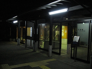 駅舎に戻った。やはり誰もいない。駅前は虫の声がしりしりしているだけだった。洗面所で支度を調えて、寝る椅子を検討。ホーム側の椅子は、誰かが入って来たときにすぐ目に留まる上、駅前側の窓からも見えそうだった。駅前側の椅子は窓があるのだから外から見えるが、見にくい位置の椅子があったため、そこに決定。駅舎の中は真っ白なライトが煌々と照っている。電気代がかかっていそうだ。このときはシュラフを持ってきておらず、下に敷くシートだけだった。嬉々として、それじゃ、おやすみ。ふだん駅の天井なんか、真下から見上げないから、天井に何か変なものがないか、急に気になって観察しだしたりした。