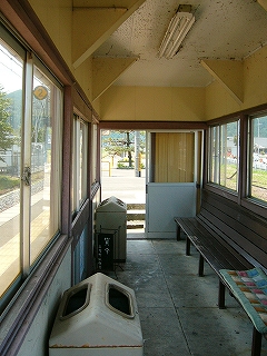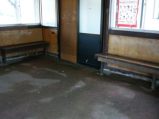 待合室。嵩上げのため、内部の床が低くなっている。