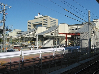 跨線橋の一部が壊され、新しい仮設跨線橋が接続されている。