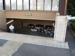 中央の設備の裏側にさきほどのエスカレーターつき地下道入口がある。