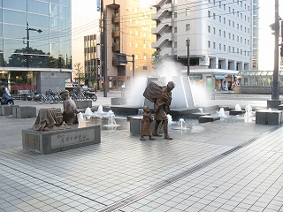 駅前交差点の一角に、越中の薬売りの彫刻を置いた平面の変わった噴水があった。感心しながらそのあたりをひとりで歩いた。夕刻になってもおそろしく蒸し暑い中、ときどき霧のように飛び散って、あたりを涼しくしている。液薬の効能でも表したいのだろうか。こんな設備でも旅人を喜ばせてしまうものなのだから不思議だった。もし私が地元の人だったら、またこんなもん造って、と気難しくなってしまうところだが、旅行者というのは案外単純なもので、いっぽう純心になれるとも言えそうだった。