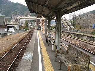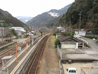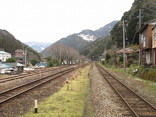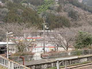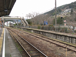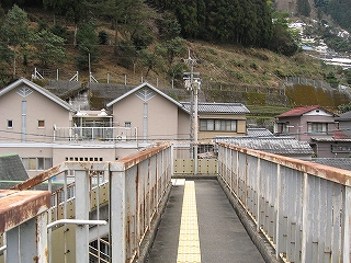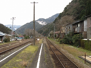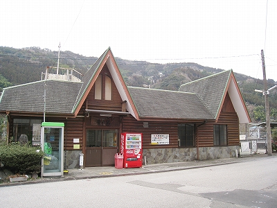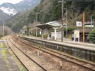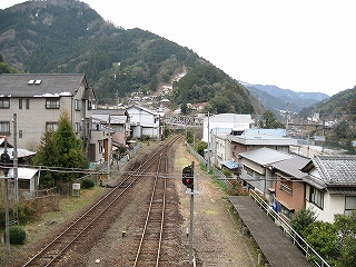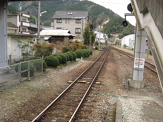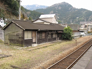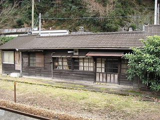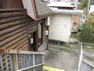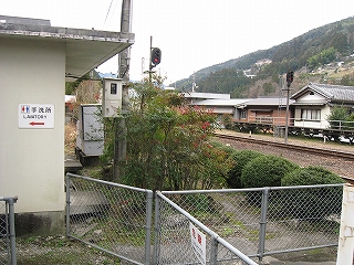 ちょっと歩いて構内にあった純木造の詰所を見に行った。たぶん旧駅舎と同じころにできたものだから、材質が同じで、駅の旧観を偲ぶことができそうだ。こういうものが取り壊されず残っている場合、たいてい保線などの仕事道具がしまわれていたり、保線の休憩所として使われていたりする。ガラス越しに覗いたが、その部分はストーブや扇風機があるきりで、カーテンが裂けて垂れたり、埃が積もったりの、覗いていると気味悪くなるような状態であった。しかもこんな山峡にある大昔の詰所となると早く我に返りたく思い、目を離して近くの駐車や店を見たときはほっとした。
