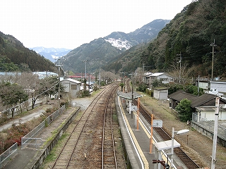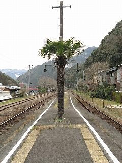 駅舎前の販売機で飲み物を買い、冷え込んだ駅舎に入り腰を下ろして、朝食を摂った。食べ終わりホームに向かおうと跨線橋に立った瞬間、もう予定を棄てて帰ろう、と思った。冬の静かな山を見ようぞというものの、二度続いたかなり厳しい寒村に、苦しくなっていた。それに加え、曇天。そしてたぶん寝不足。ホームの端にはまたもやでーんと椰子の木が立っているのがここから見える。晴れて大歩危側から来たのなら、「もう椰子の木が見える。こうして海に近づいていくんだ。まだ遠い太平洋が近く想われた。」などと私は言い出すのかもしれない。しかし今はいたずらにため息を出させる、ぼうっと突っ立つここに似つかわしくない木だった。そもそもここは海側と気候がまったく違う。ほとんど目立たぬよう道の隅のほうに硬くなって残っていた雪にも、まだまだ準備の最中だから、と言われているかのようだった。