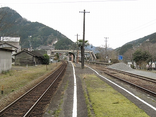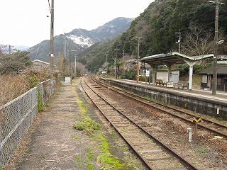 ここは駅としては規模があるようで、ホームが単独で2つあり、離れた駅舎とを堂々と跨線橋が結んでいた。でも国道側のホームは、もう使われていないようだ。線路の様子がおかしい。駅舎は国道とは反対側にぽつんとあるようだ。