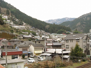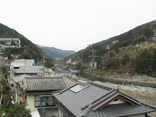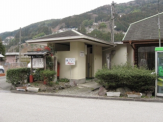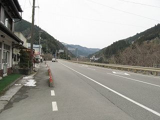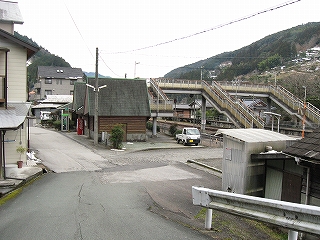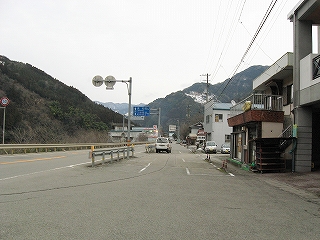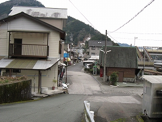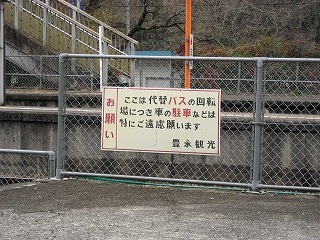 駅前に豊永観光バスが、バス転回場のため駐車禁止、との旨の表示を複数出していた。こんなとこに観光バスが来るのはおかしいと思ったが、そういう名前のバス会社が路線バスを動かしているのだった。もし駐まっていて転回できないとなるとそれは大変だ。そして転回場ということからわかるように、どうもこの駅前の道はこれより少し先で行き詰まりと考えられているらしい。この先は幅員も狭まり、やがては八川というまたもや山腹の集落へと向かう。