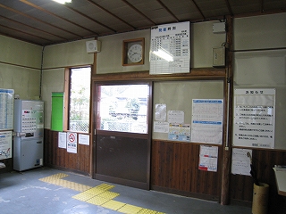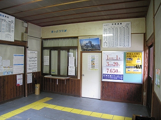 階段を下りて、戸を静かに引いて駅舎に入ると、思いのほかしーんと染み込むように冷え切っていた。中は新しい木造ながらも、すでに町らしさが出ている。窓口は閉まっているが、張り紙や置き時刻表などから、どうみても現役で、休日のための休みということだった。定期券販売などのために開けるようだ。
