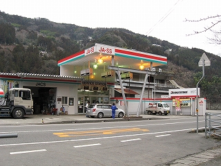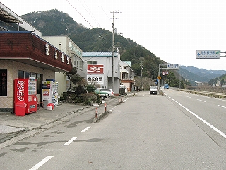 国道側。ガソリンスタンドの奥に豊永観光と書いた古い建物があった。