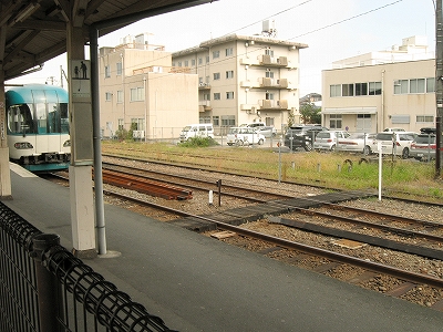 丸石積みのホームと街。ホームの向こうに貨物関係風の空き地があった。