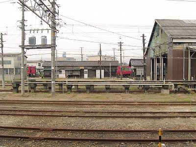標高が下がり但馬に入ると、再び丹波霧に苦しめられ、その影響ははるか終着豊岡にまで及んで消えることはなかった。ホームにいるが、もう霧か曇りか区別がつかない。豊岡まで出て来てこれではもう海岸はだめだろうと思い、「とりあえずこの街を見て、引き返すことにするか」。しかし気分は沈んでばかりいたわけではなく、燻されたような木造小屋のある、汽車を機関士たちが動かしていそうな構内が広がりゆくのが見られて、とうとうこんなところまで来たかと、気持ちはいっぱいになった。時代の差が 距離をもたらしてくれたのだろう。いまは赤紫の一両の気動車が豊岡と香住や、浜坂までを区間運転するにすぎず、何もかも小さくなってしまったようで、歩いている運転士も体躯さえも細身に見えた。けれども赤が日焼けしたような色の車体が、がらがら音を立てて、窓に人の横顔が並んでいるのは、地方の極限に来たようで、これはこれですでに別の時代だった。