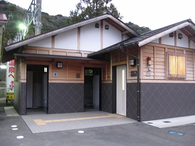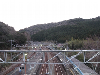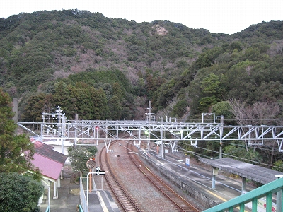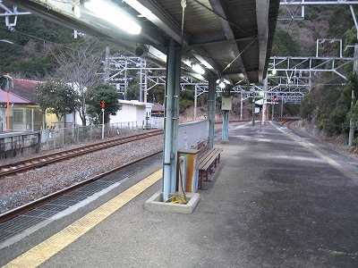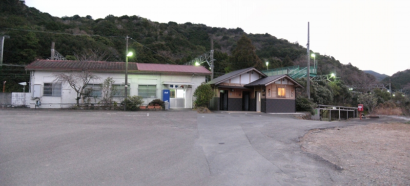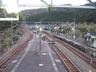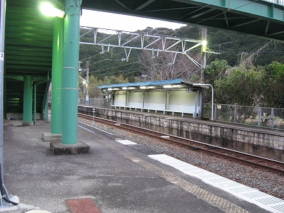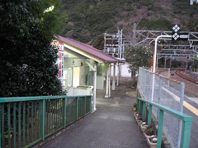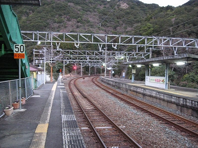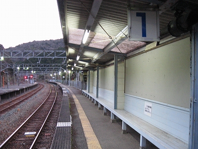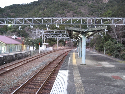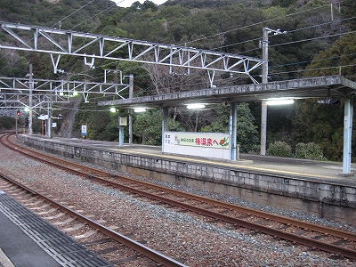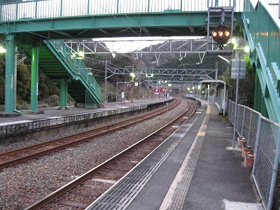 夜は怪談じみていたが、明るくなり始めても昨夜の印象が強烈で、容易には取り払われなかった。客観的に言えば、山間部ながらも区間では珍しく三線構造を切り開き、海辺の温泉地への歓迎板や塔があって、旅行者の足跡や旅のいざないを感じる駅だった。