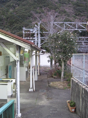 かなり登ったところにあるので、穏やかな山の中腹に取り巻かれているが、杉林が多いから、かつてはもう少し拓けていたかもしれない。こうしてただでさえ山中だから、駅前広場は冬の風にあおられ、ますます荒んでみえる。それはそれで紀南の冬の無人駅らしいところだったが、そこに本当は人が来ているのに、まるで風が攫いづけているように見えた。
