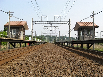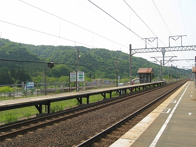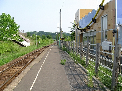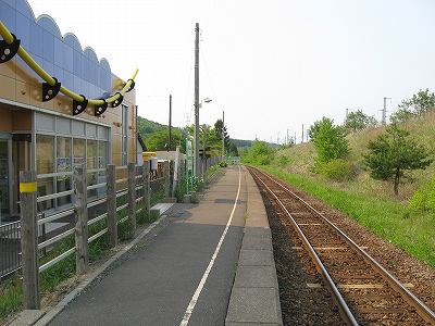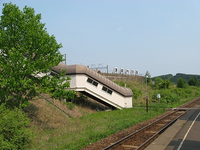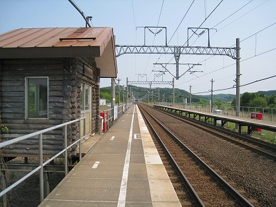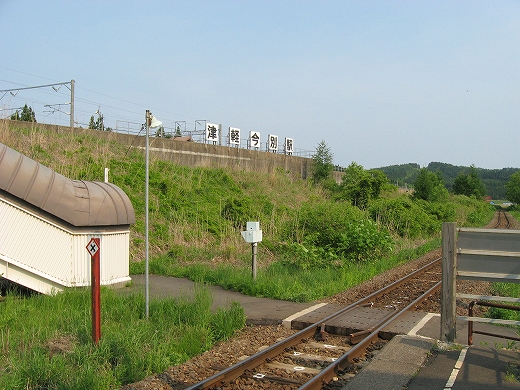 ホームが2つあるので構内踏切になっているものの、一糸乱れぬ二直線なので、渡っている先から一瞬にして粉砕されそうだ。しかしそんなに通過もないとわかると、しいんとして広々とした高台の気持ちよい停車場。ぬくまった空気の中、おとなしい里山に緩やかに囲われ、視界もほどほどに自由、竜飛の断崖があるなんて想像もつかない。トンネルと同時にできたからどれも新しいけれども、ホーム長に比して豆粒のような丸太風の待合室がわざわざつけてあり優し気使いがあった。ちなみにこの駅は津軽二股と違い管轄はJR北海道だ、と謳っていて、じっとりした津軽線の雰囲気とは劃し、風もよく当たり造りからもすがすがしいものを感じたが、トンネルを含む津軽海峡線を一任されてしまったというのが本当のところなのだそうな。この後、バスが着き、団体さんがこれまでの怪しい通路を経てこの構内へと入っていくのを見たが、そういう特異な利用以外でも、知内より割りと利用されていそうな感じがした。くだんの団体さんは疲れていたらしく、「上だよ上、この上ですよ。」「これからこの上に登るの?」と、変わった駅であることに一切言葉を漏らさず、ただ黙々と通路を登っていらしった。